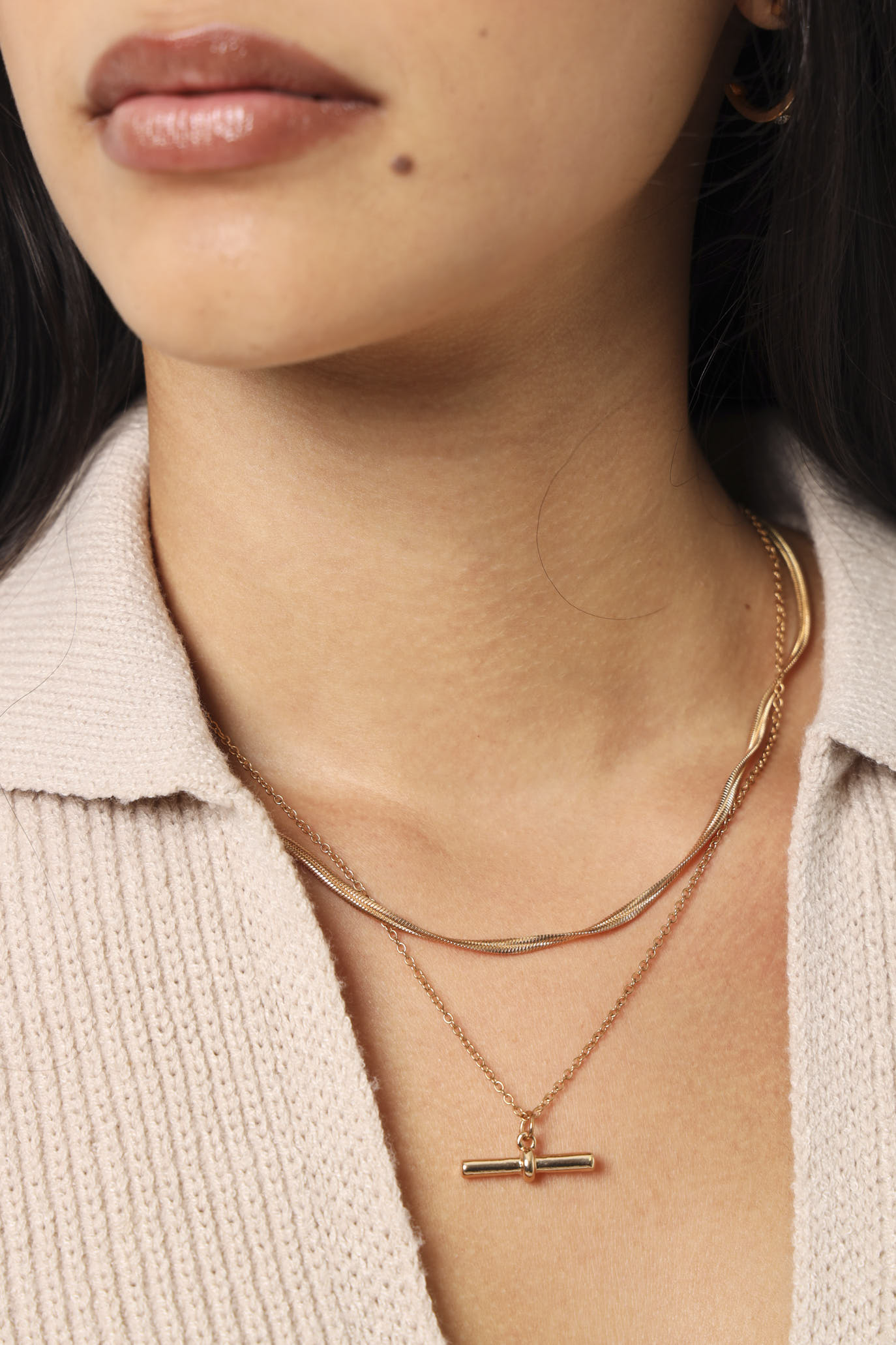 2 Layer Snake Chain & T-Bar Necklace - Gold
