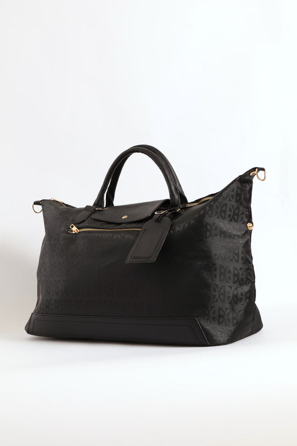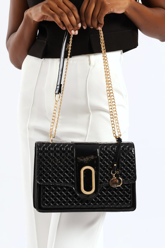 Embossed Monogram Metal Logo Charm Detail Satchel Bag - Black