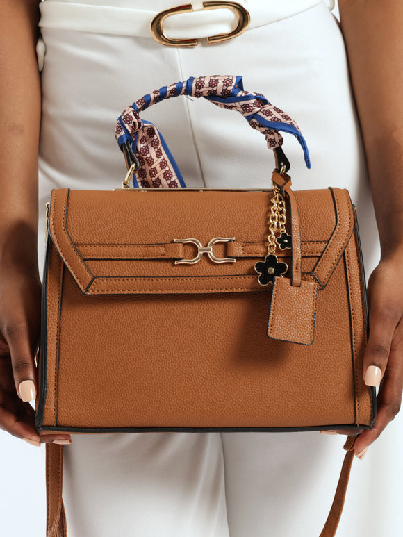 Metal Trim Epoxy Charm & Scarf Detail Bag - Tan