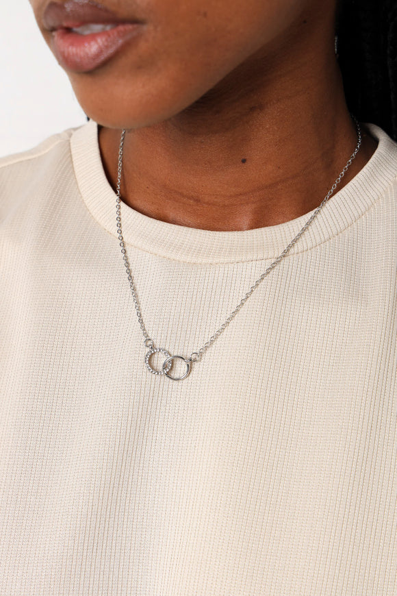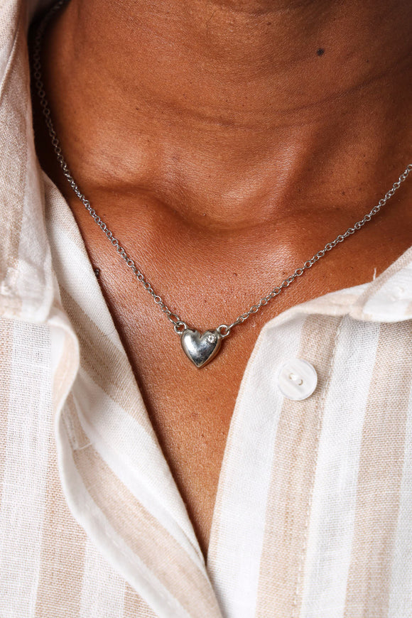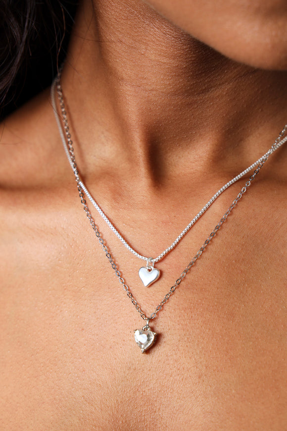 Double Layer Diamante & Gem Heart Pendant Necklace - Silver