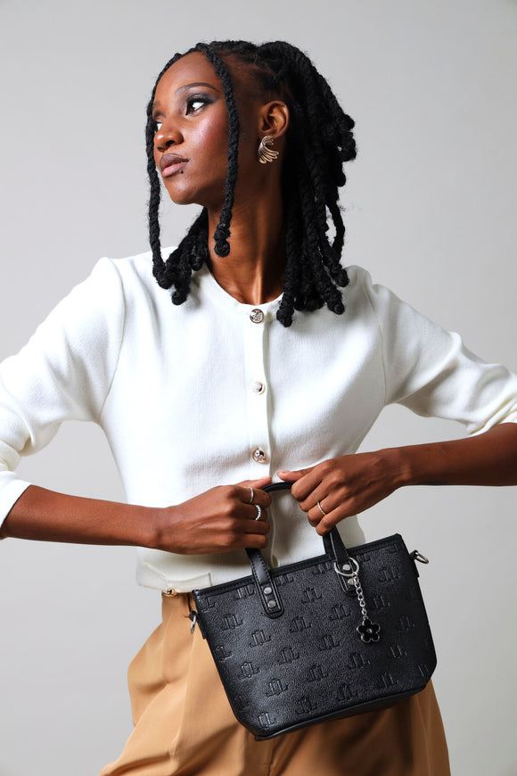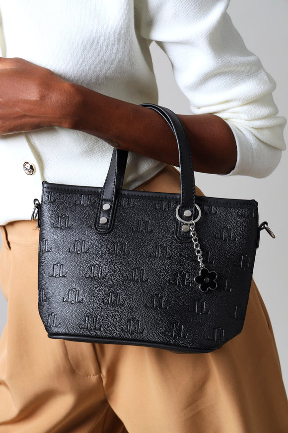 Embossed Monogram Epoxy Flower Charm Tote Bag - Black