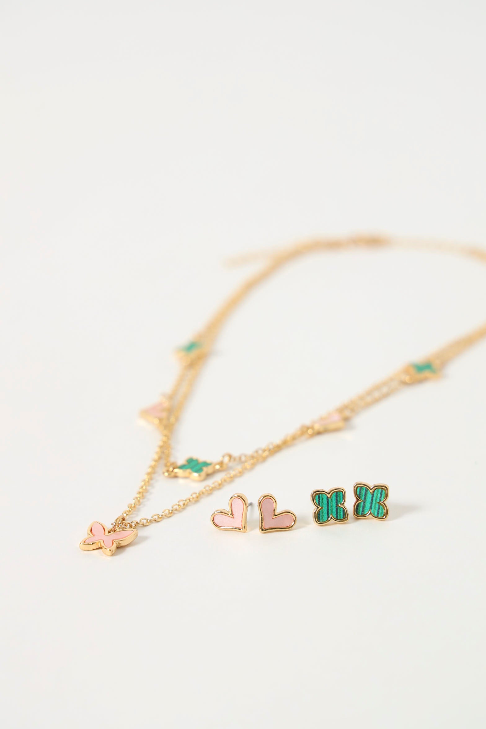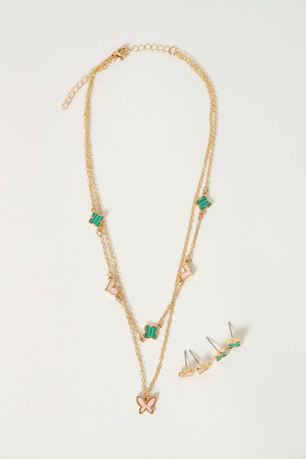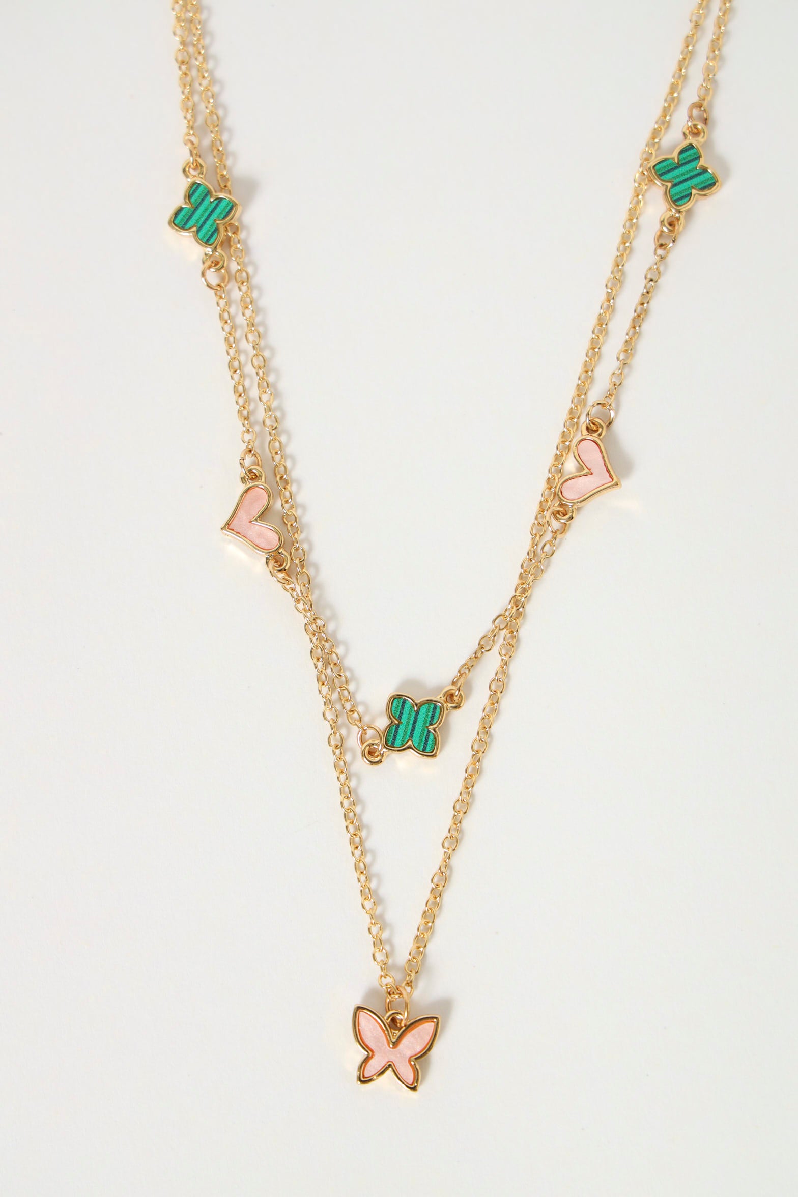 2 Layer Epoxy Flower Butterfly & Heart Charm Necklace - Gold