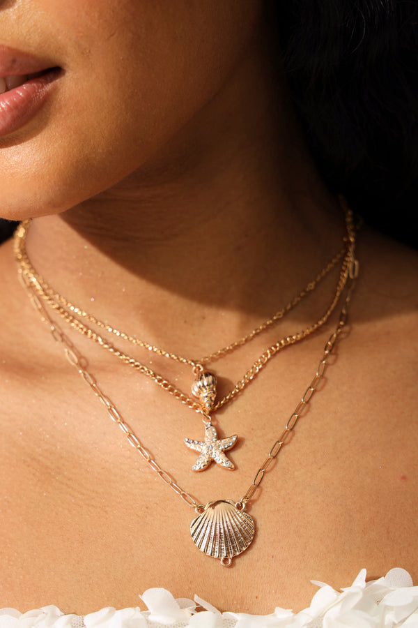 3 Layer Diamante Shell Pendant Necklace - Gold