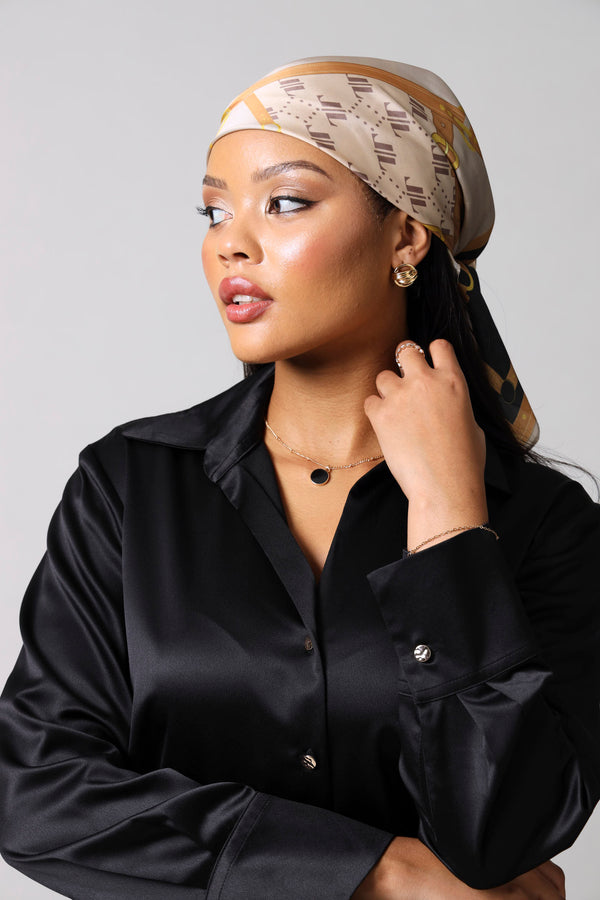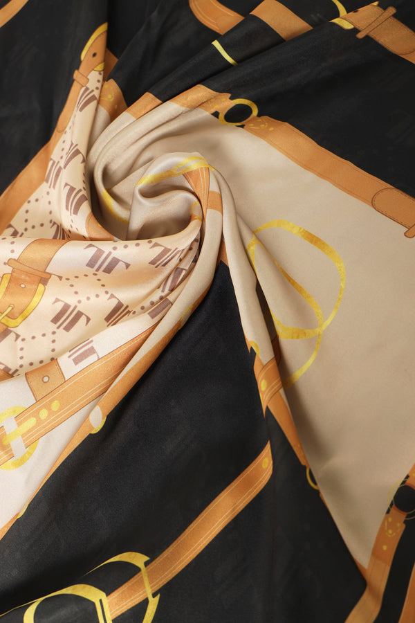 Tie on this luxe chain print satin scarf and instantly elevate your entire vibe. The striking black and gold palette adds instant glamour to any ensemble—drape it around your neck, tie it in your hair, or style it as a chic headwrap for endless possibilities. Silky smooth and undeniably eye-catching, this scarf is your ticket to looking effortlessly fabulous with a touch of bold, playful edge.