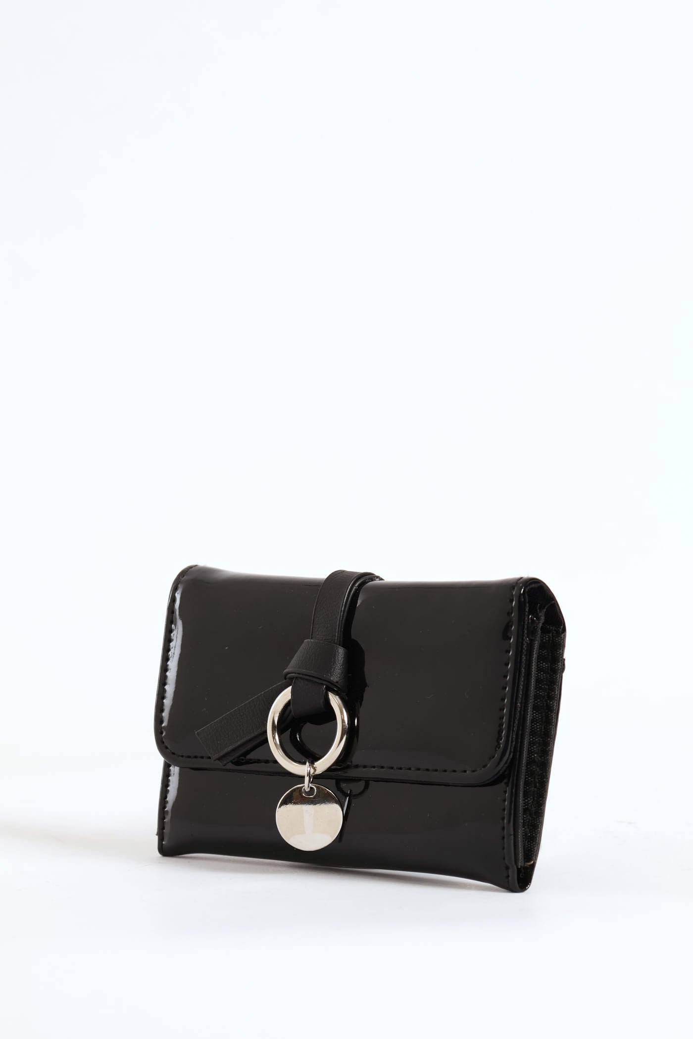 Keep your essentials tied up with a twist of fun in the Charm Knot Detail Flapover Wallet in Black. Its sleek design is spiced up with a playful knot charm, while the flapover style ensures your cards and cash stay neatly secured. Perfect for adding a little personality to everyday organization!
