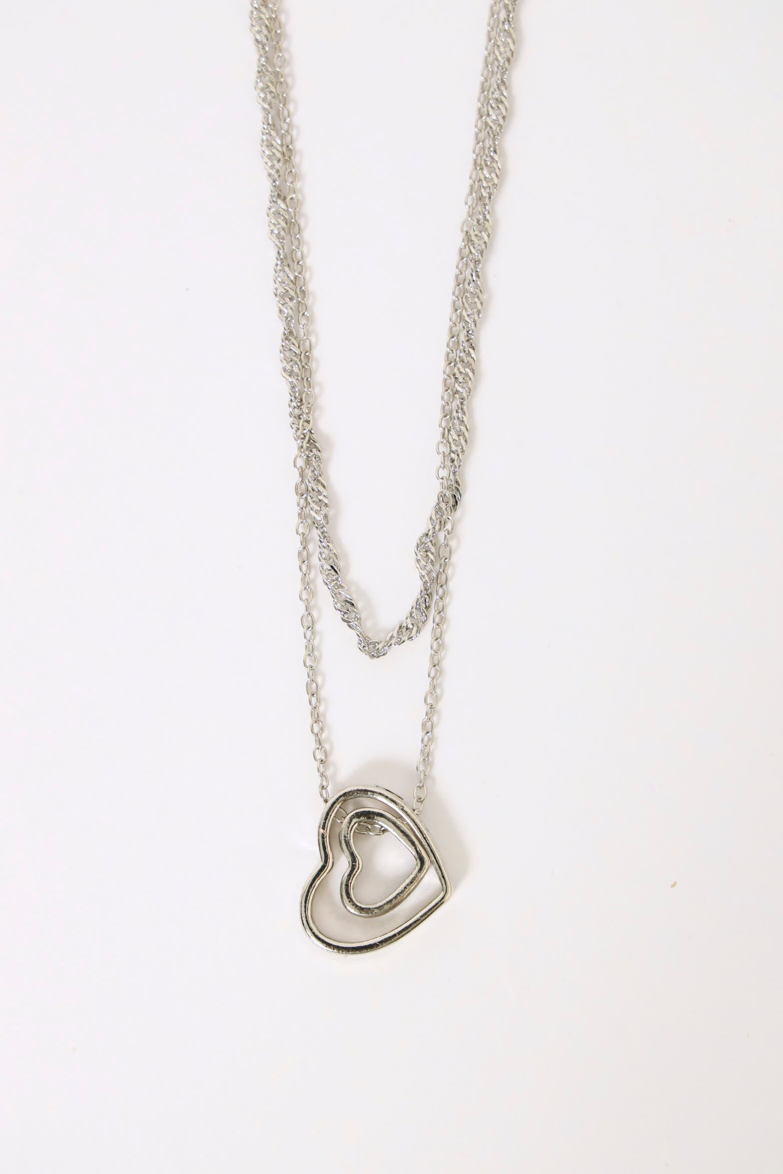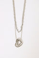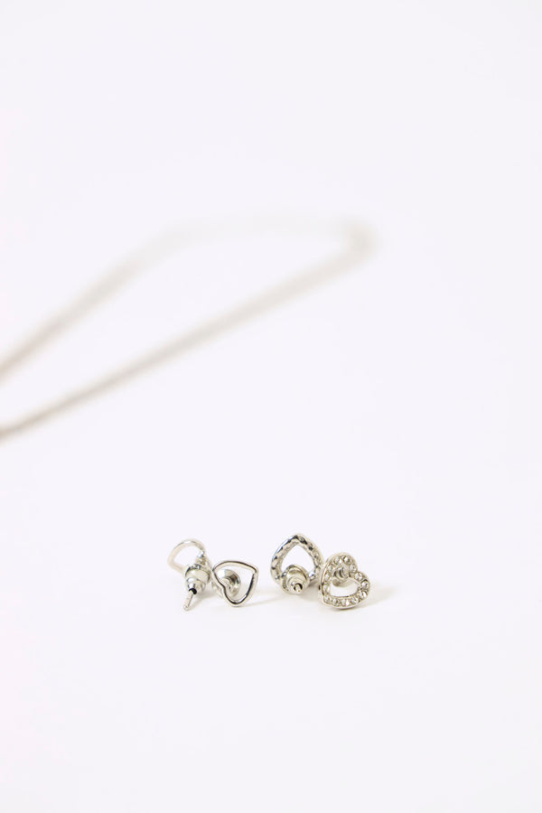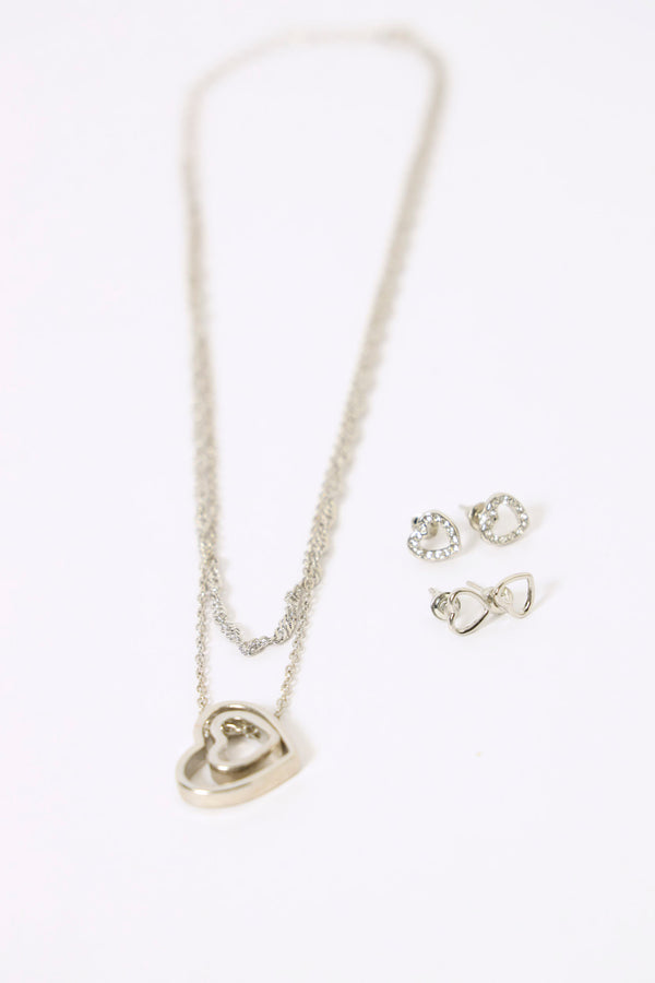 Double Layer Diamante Heart Pendant & Matching Earrings - Silver