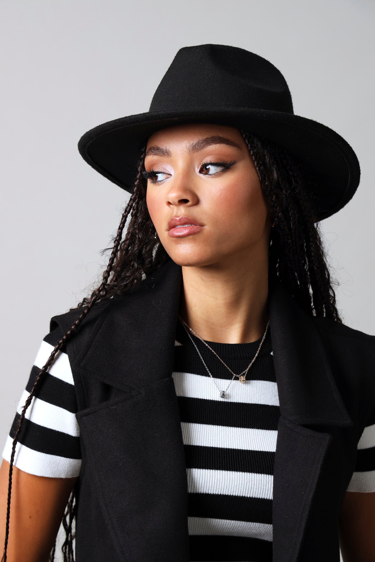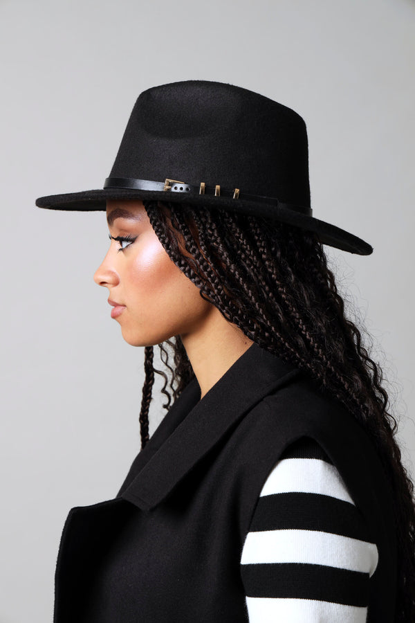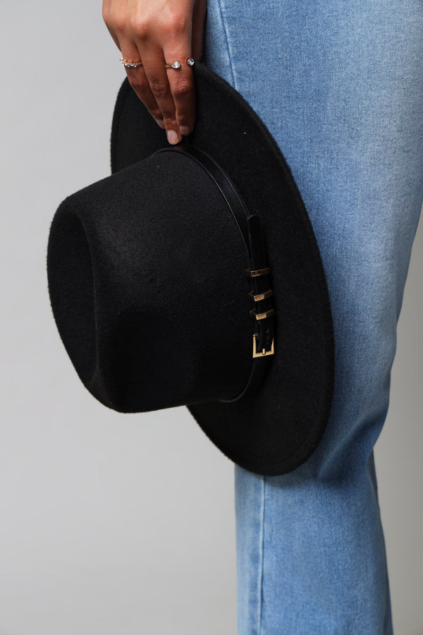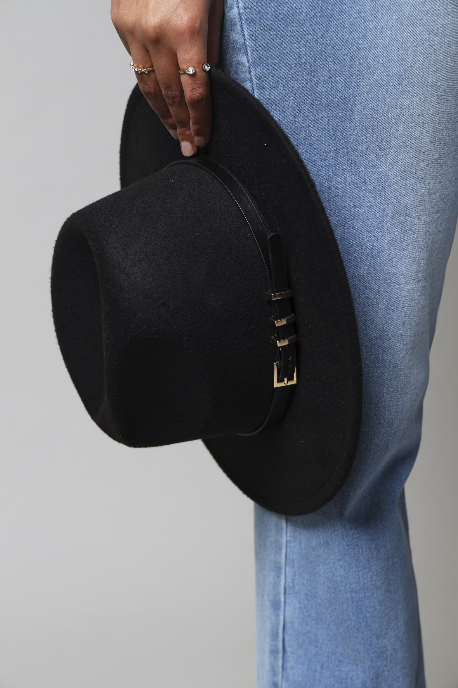 Top off your casual looks with effortless style. This sleek black felt fedora features a distinctive metal buckle trim detail that adds just the right amount of edge. Whether you're dressing down jeans and a tee or elevating your everyday ensemble, this hat brings personality and polish to any relaxed outfit. A playful accessory that proves casual never looked so good.