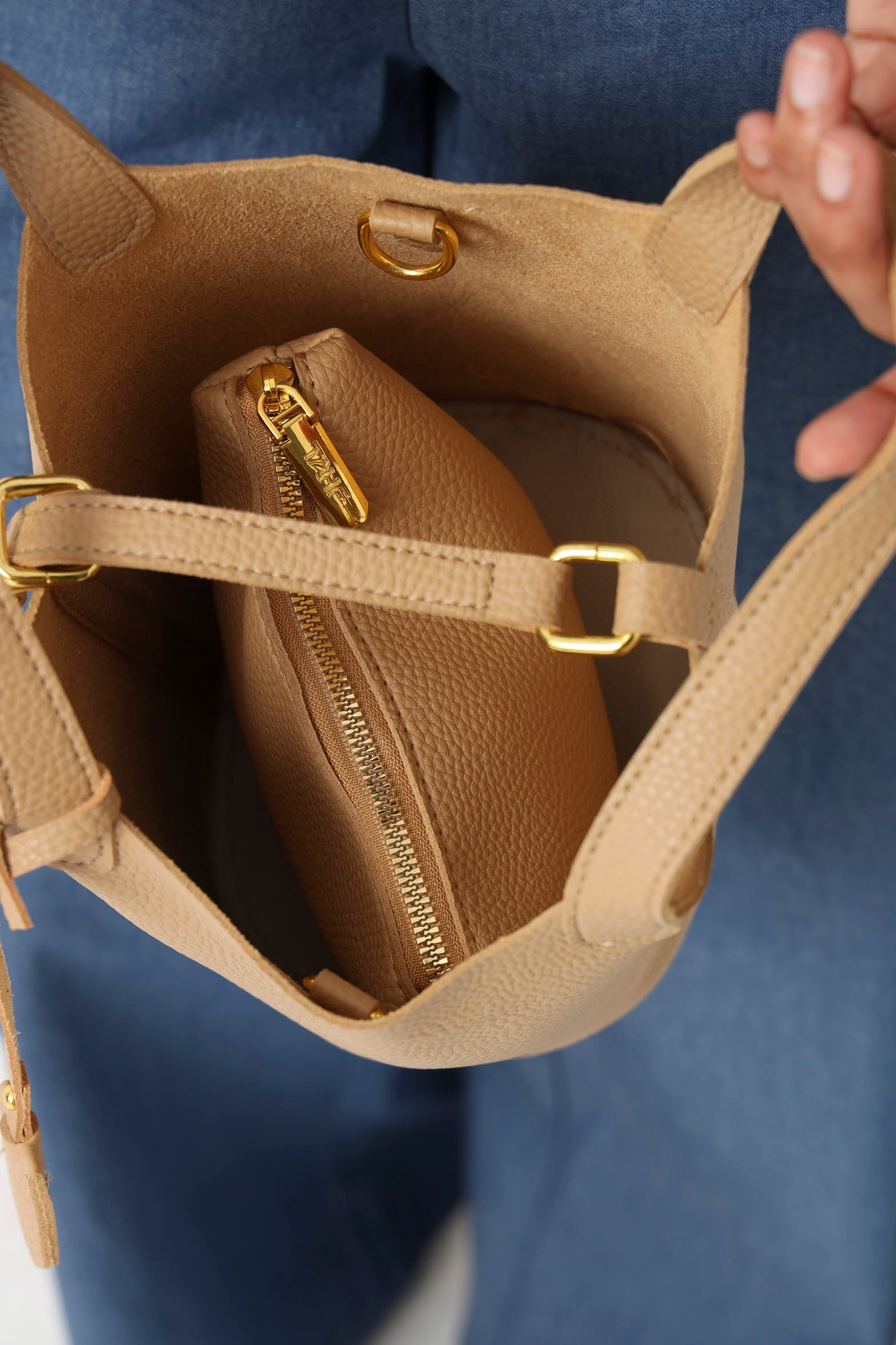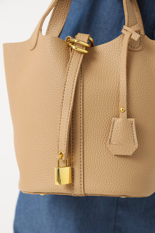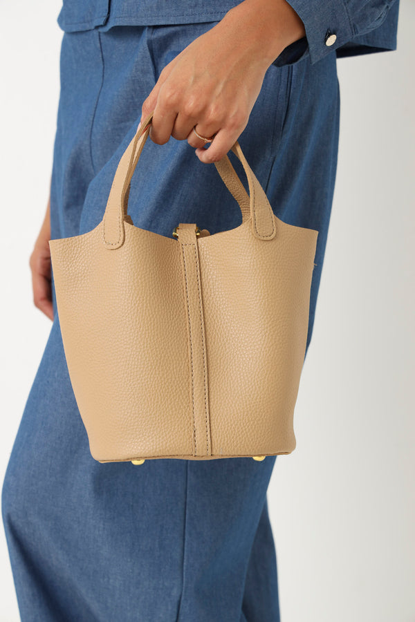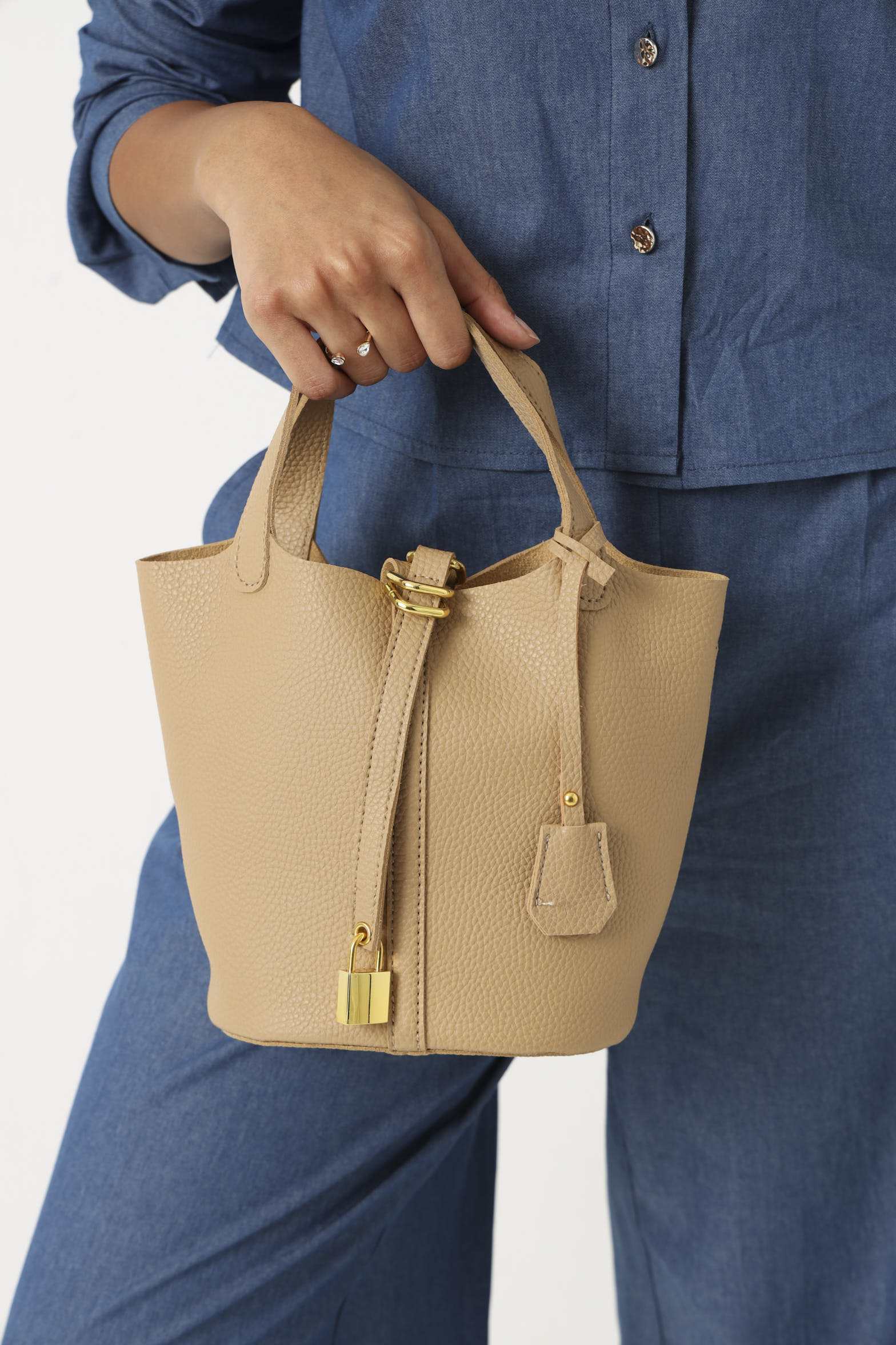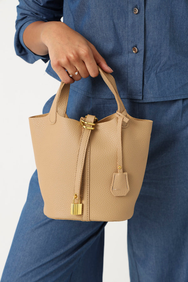 Elevate your everyday carry with this sophisticated Metal Lock Bucket Bag in rich dark beige. Featuring a distinctive metal lock closure that combines security with contemporary style, this versatile piece transitions seamlessly from day to night. The structured bucket silhouette offers generous capacity while maintaining a refined aesthetic, making it the perfect companion for work, weekend outings, or casual gatherings. Crafted for durability and designed to complement any wardrobe, this bag delivers both functionality and timeless elegance.