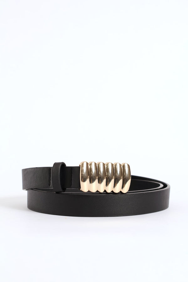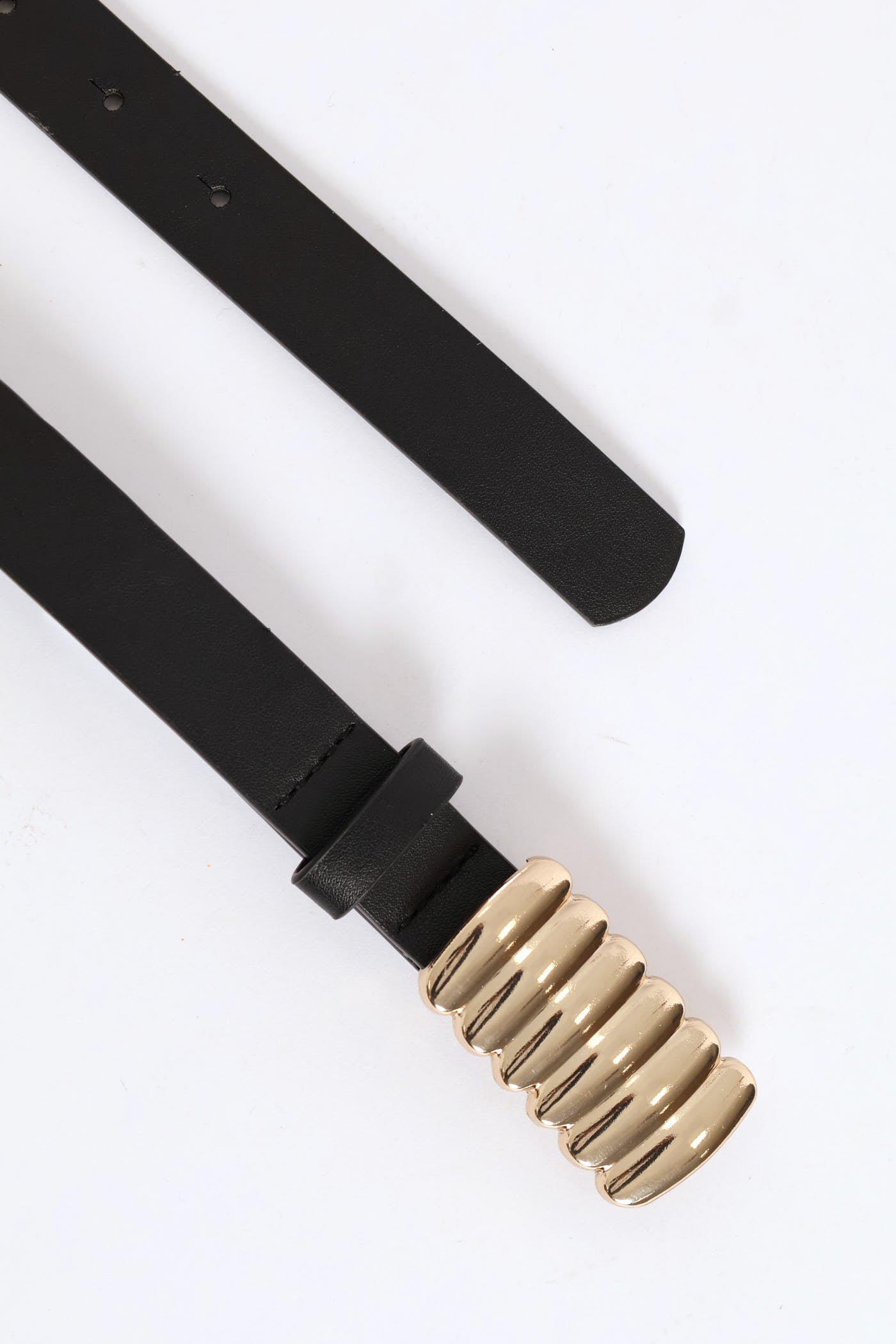 Make waves with this sleek black belt featuring a distinctive ripple buckle design that adds texture and visual interest to any outfit. Whether you're cinching in a dress, defining your waist over a blazer, or adding edge to casual jeans, this belt does the heavy lifting. The modern ripple detail keeps things fresh and fun, while the classic black hue pairs with absolutely everything. A playful accessory that proves the best belts do more than just hold things together—they transform your whole vibe.