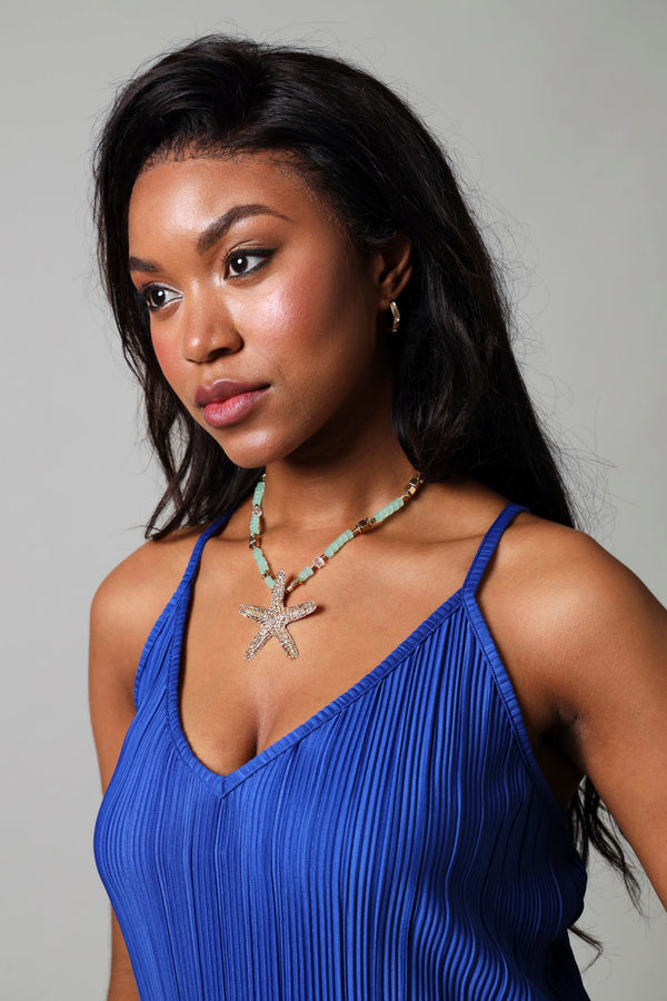 Make waves with this stunning statement starfish pendant necklace in gleaming gold. Bold, beautiful, and unapologetically eye-catching, this piece brings coastal charm and a dash of drama to any outfit. Whether you're channeling mermaid energy or just love creatures of the sea, this starfish stunner is your ticket to turning heads. Layer it with delicate chains for maximum impact or let it shine solo—either way, you're serving serious style with a side of fun.