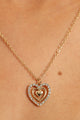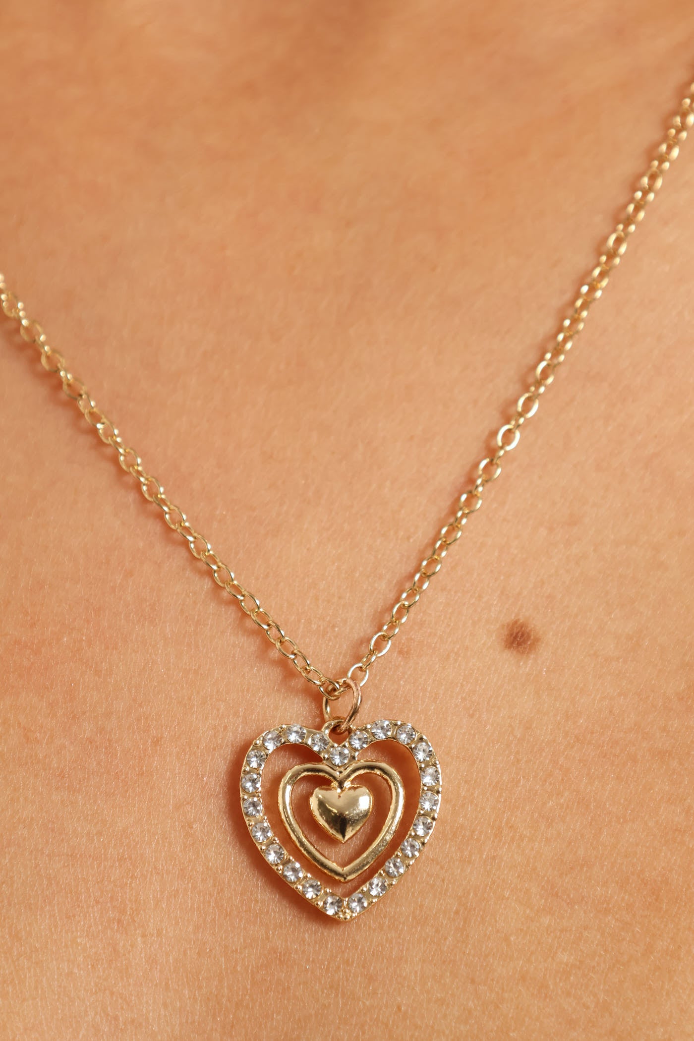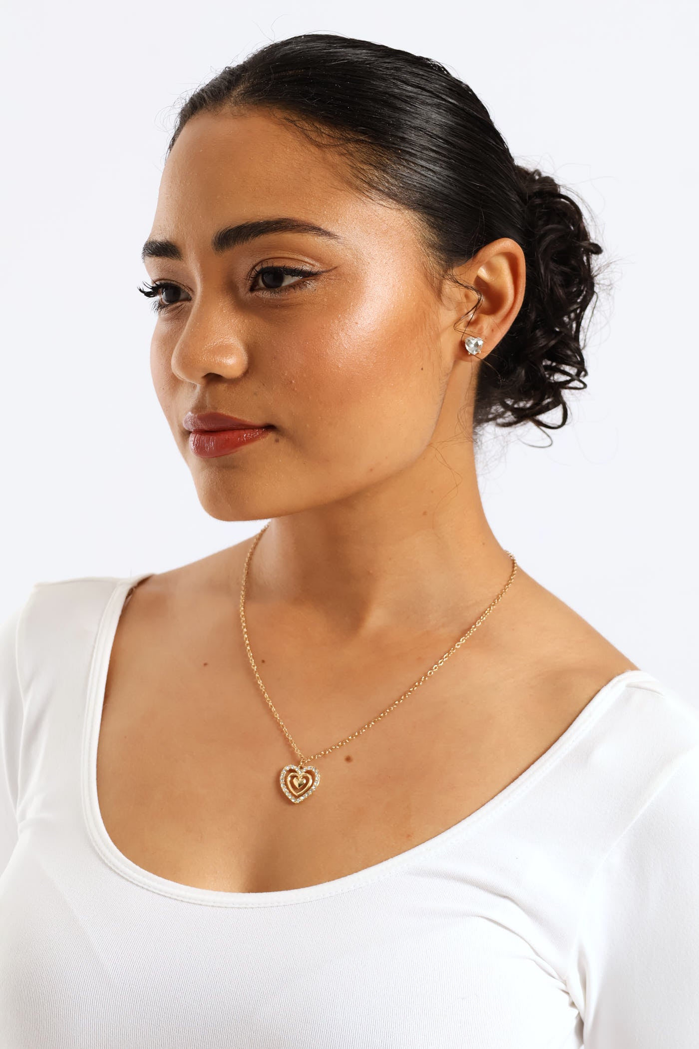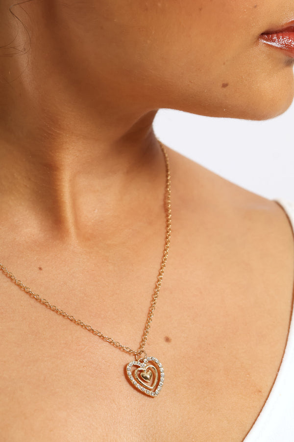 Tripple Layer Diamante Heart Pendant Necklace & Matching Earrings - Gold