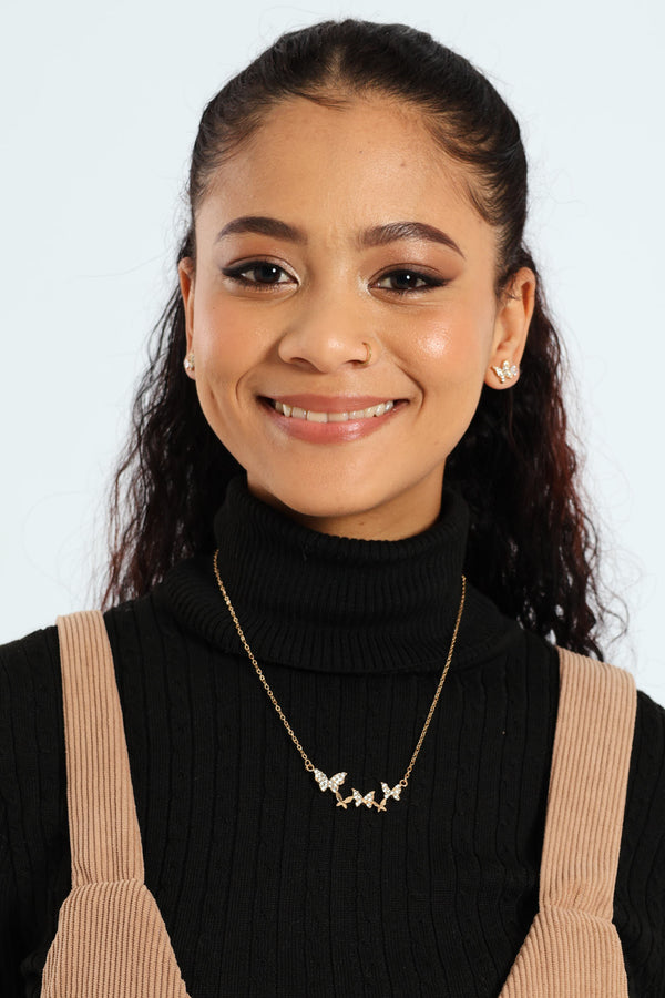 Cluster Diamante Butterfly Pendant And Matching Earrings - Gold