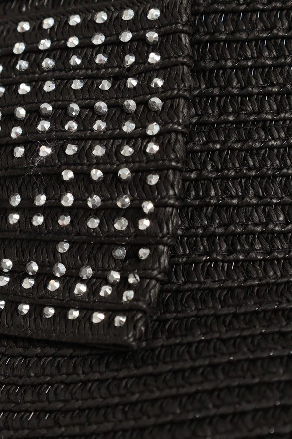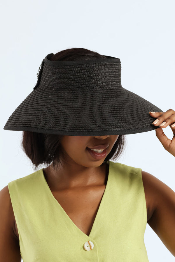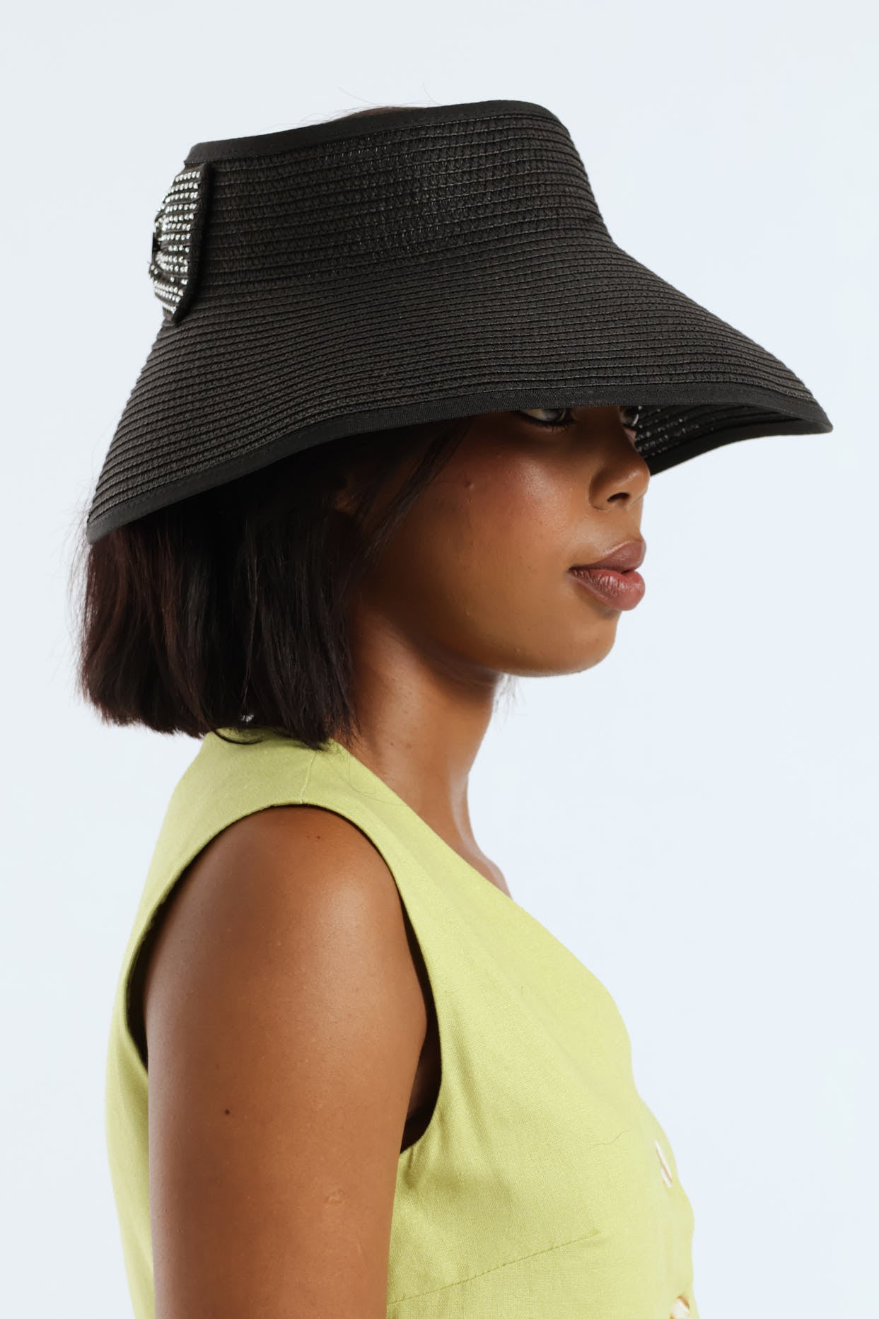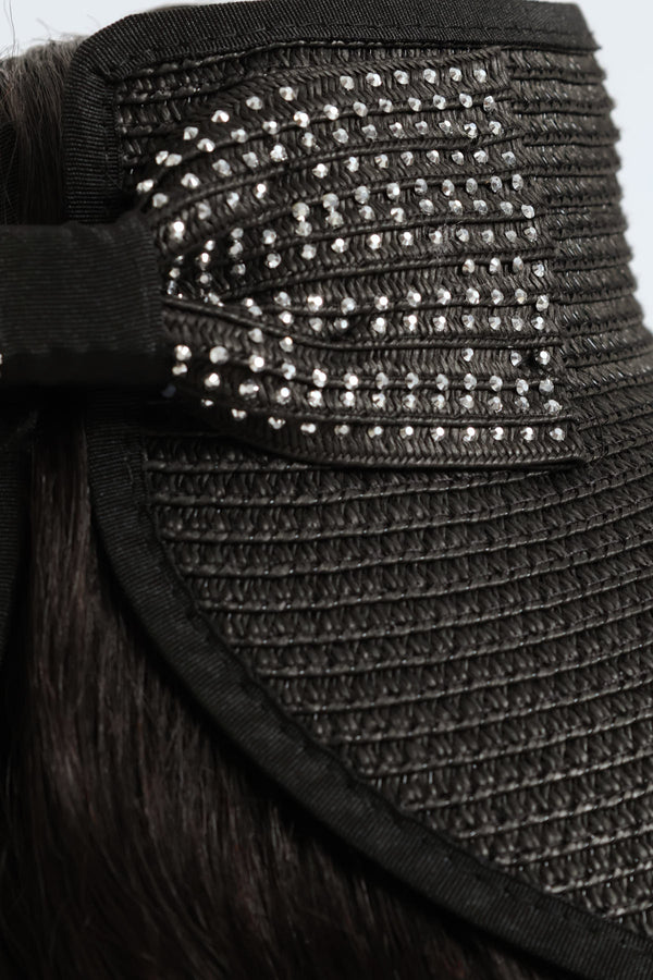 Shade yourself in sparkle with the Diamante Bow Straw Large Visor Hat in Black. This playful hat combines sun-smart wide coverage with a dazzling diamante bow, perfect for turning heads while keeping cool on sunny days. Stay fabulous and fun from beach to backyard!