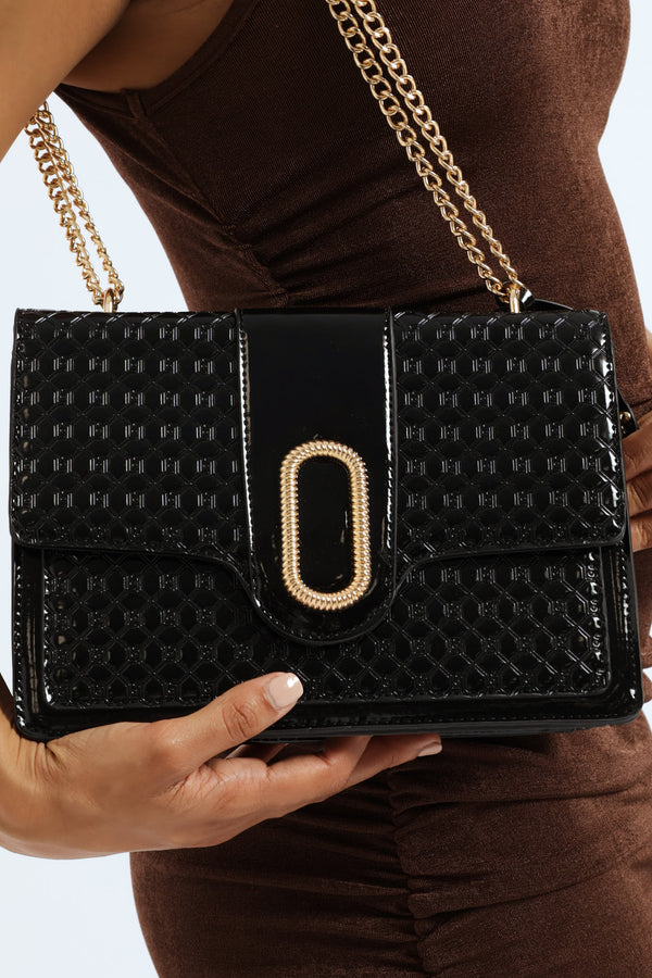 Embossed Monogram Metal Logo Charm Detail Satchel Bag - Black