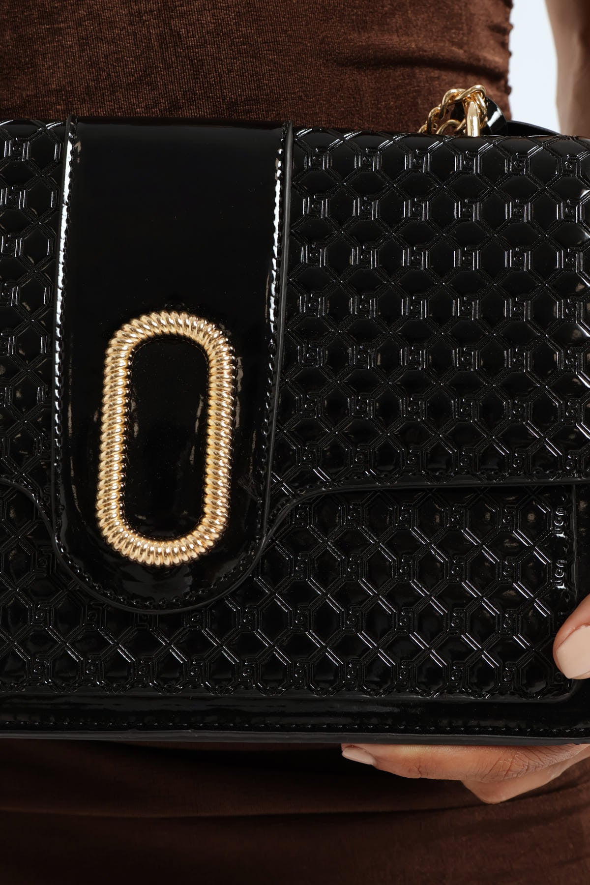 Carry your essentials with a wink of style in the Embossed Monogram Metal Logo Charm Detail Satchel Bag in Black. This playful bag features a chic embossed monogram and shiny metal logo charm that add personality and flair to your everyday look. Perfect for those who love a little fun with their fashion!