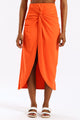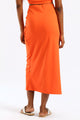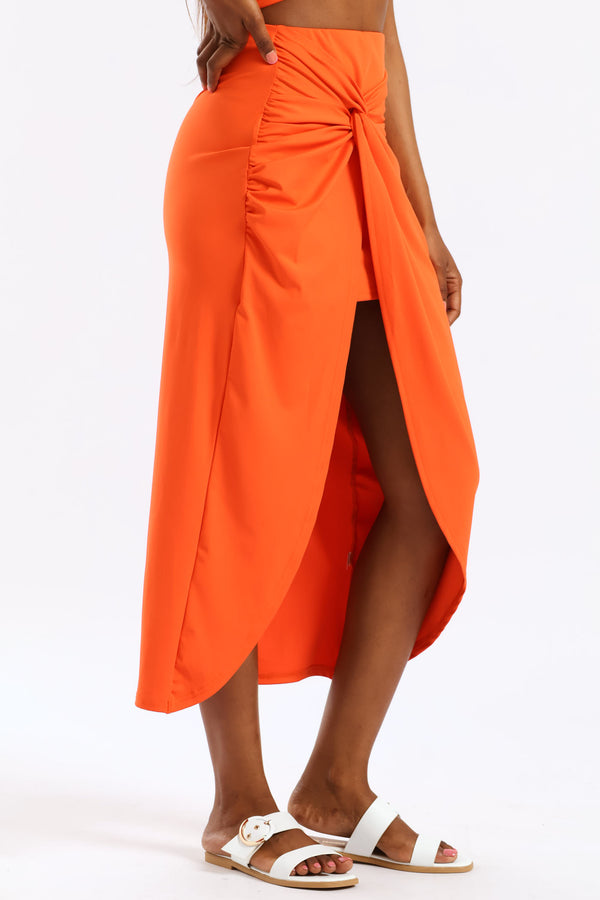 Brighten your wardrobe with the Maxi Twist Front Slinky Skirt in vibrant orange. Its playful twist detail and flowing slinky fabric create a flattering silhouette that moves with you. Perfect for adding a fun pop of color to any outfit, this skirt effortlessly blends comfort and style for day-to-night wear.