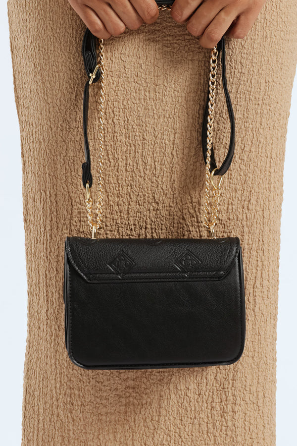 Carry your essentials in style with the Ornate Clasp Embossed Satchel Bag in Black. Featuring intricate embossed details and a charming clasp, this bag adds a playful twist to your everyday look. Perfect for adding a touch of flair while keeping your belongings close and secure.