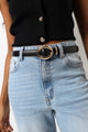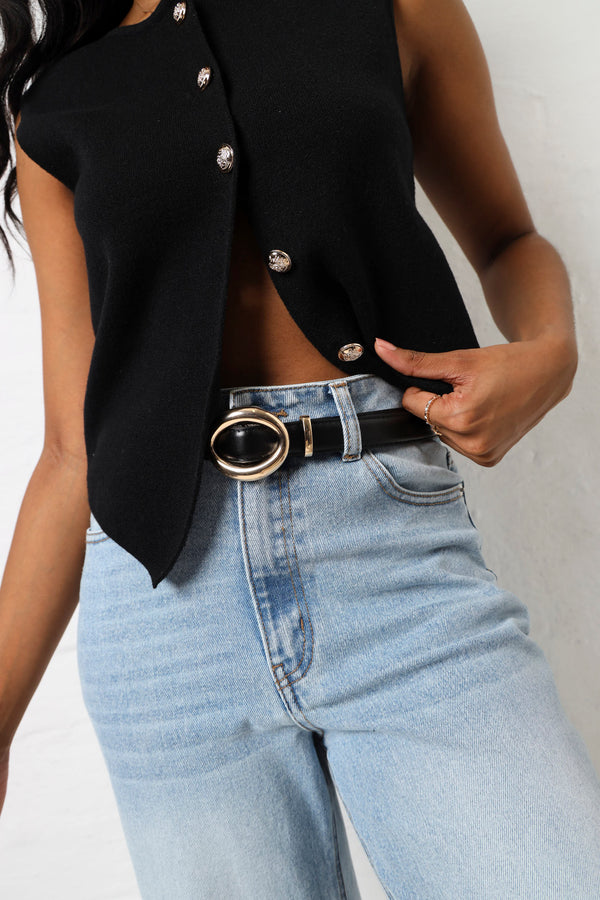 Cinch your style with this striking black and gold belt that's ready to elevate any outfit. The eye-catching oval buckle with metal puller detail brings just the right amount of glam without taking itself too seriously. Whether you're dressing up your jeans or defining your waistline, this versatile accessory works overtime to keep you looking sharp and feeling confident. Classic meets contemporary in one effortlessly cool package—the finishing touch your wardrobe's been waiting for.