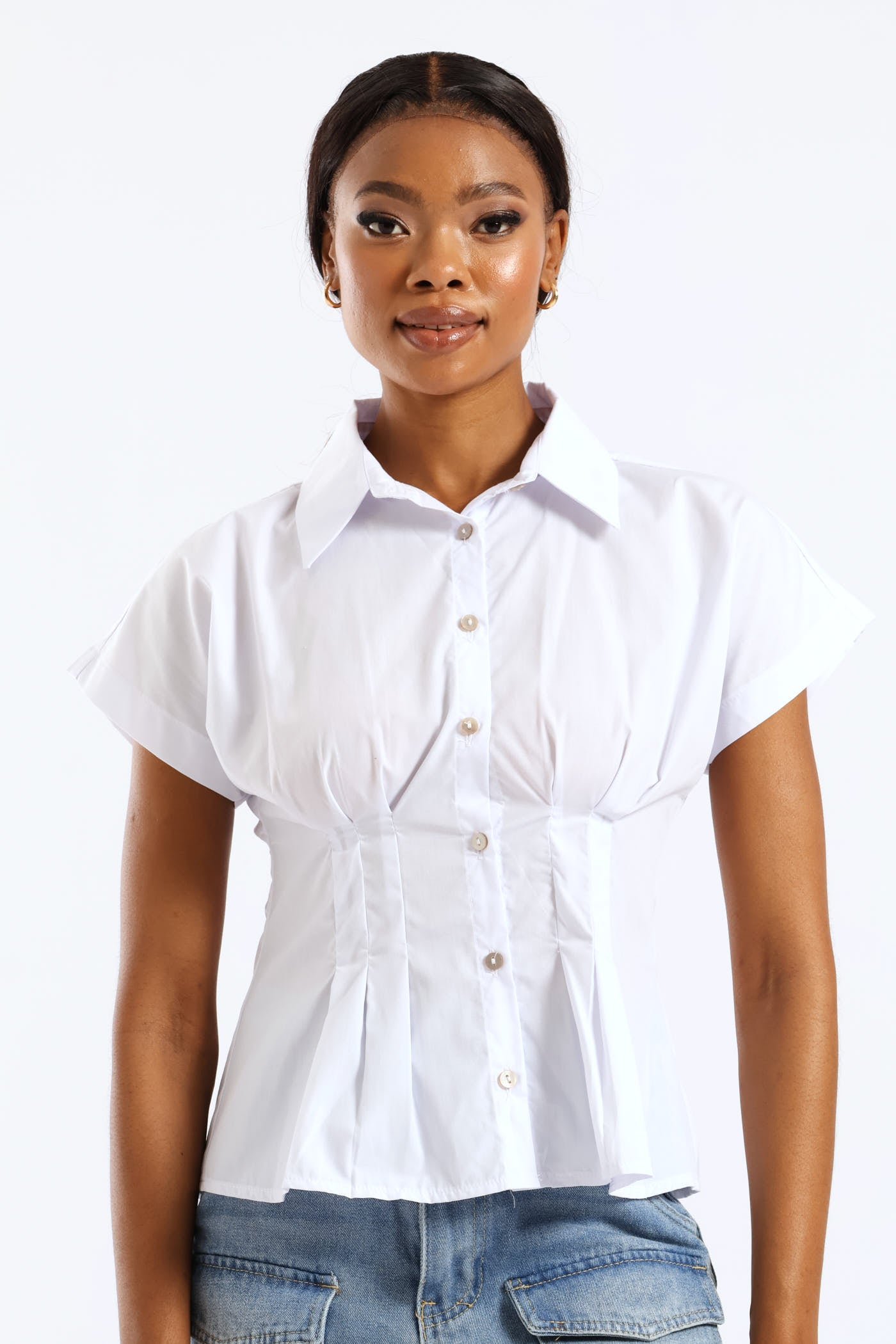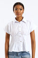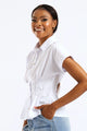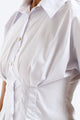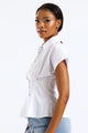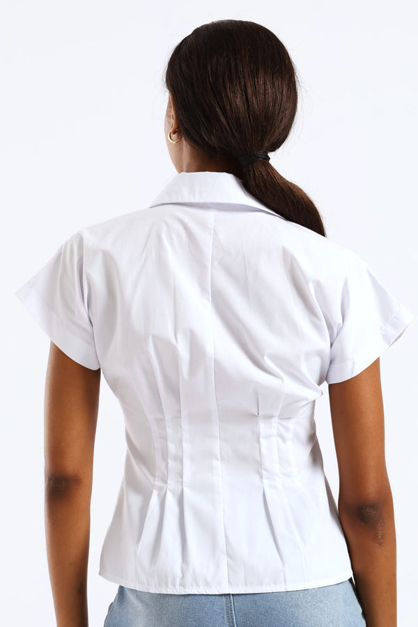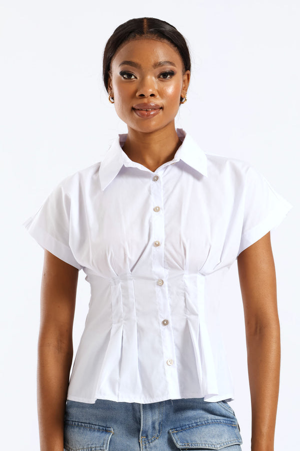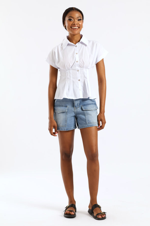Short Sleeve Cinched Waist Button Through Top - White
