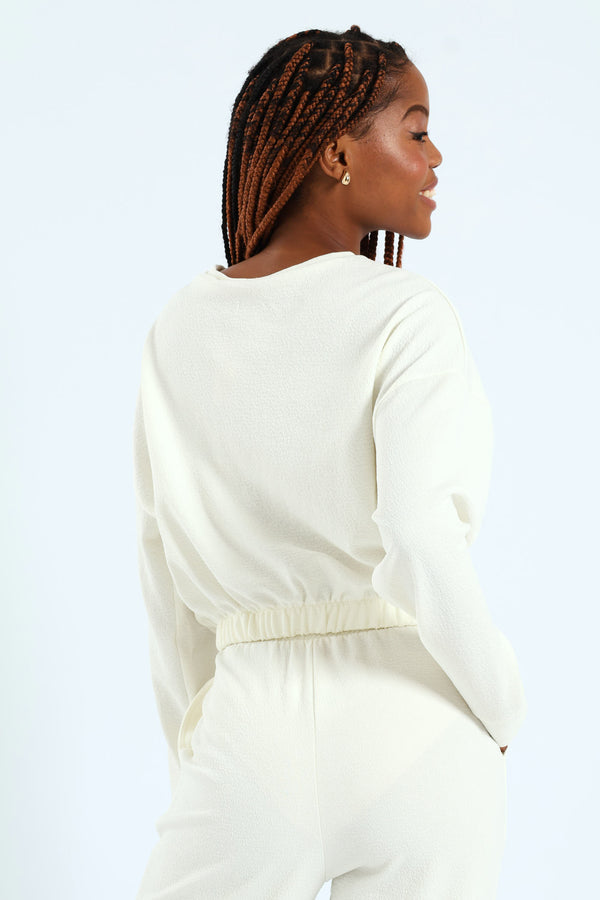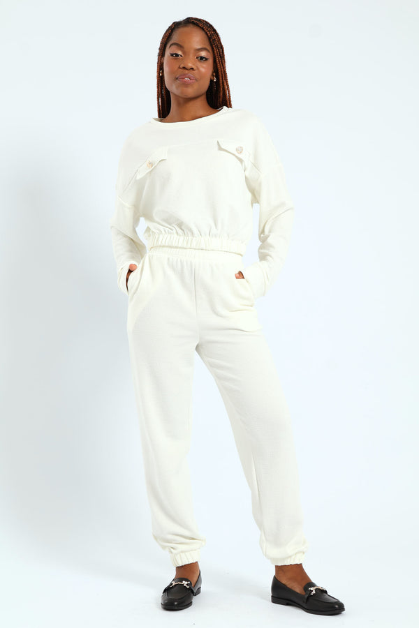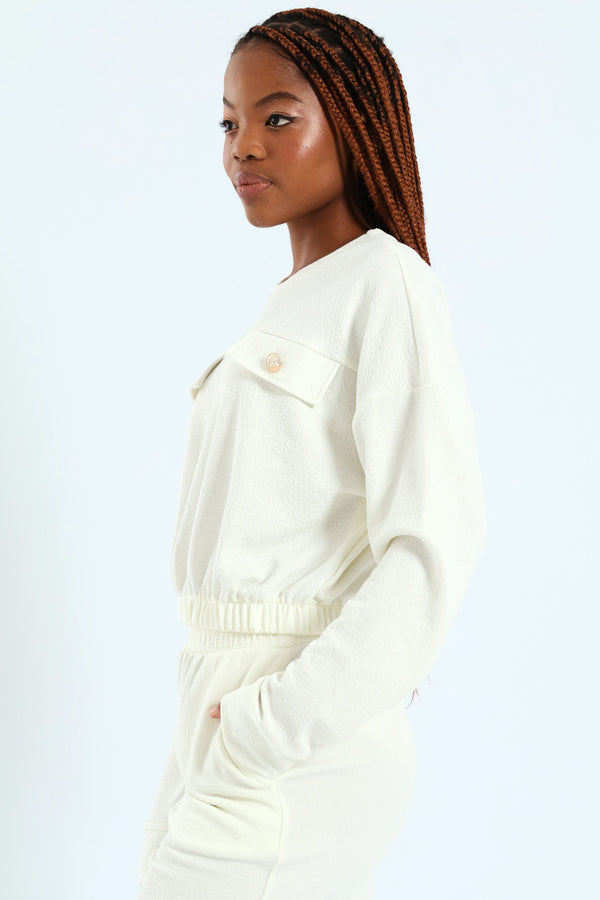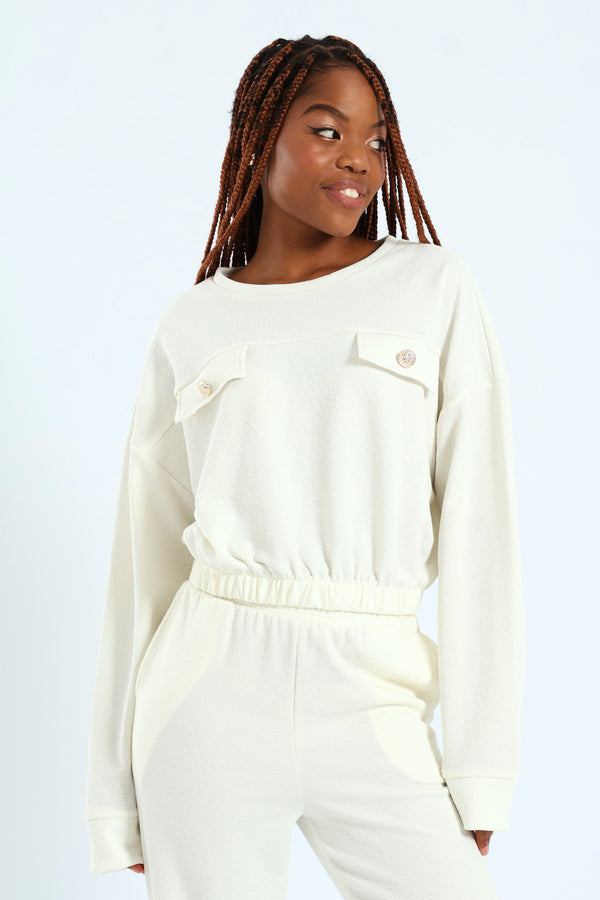 Elevate your wardrobe with our Textured Knit Button Detail Pullover in White. Made from a luxurious textured knit fabric, this pullover features intricate button detailing and is part of a matching set. Add a touch of sophistication and style to any outfit with this exclusive piece.