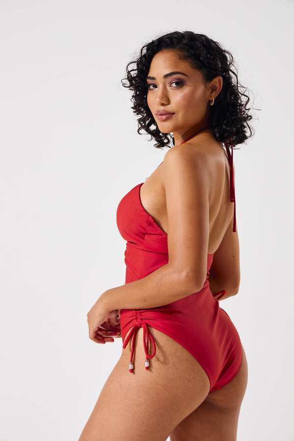 Make a splash in this playful rust-colored one-piece swimsuit featuring stylish cutouts and charming details. Perfect for soaking up the sun with a fun, flirty vibe, it combines comfort and unique design to keep you feeling confident while you enjoy the waves or poolside lounging.