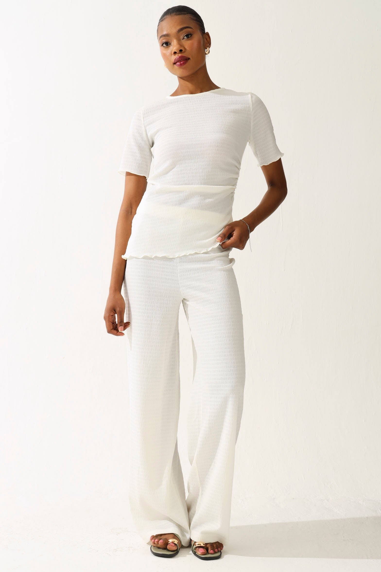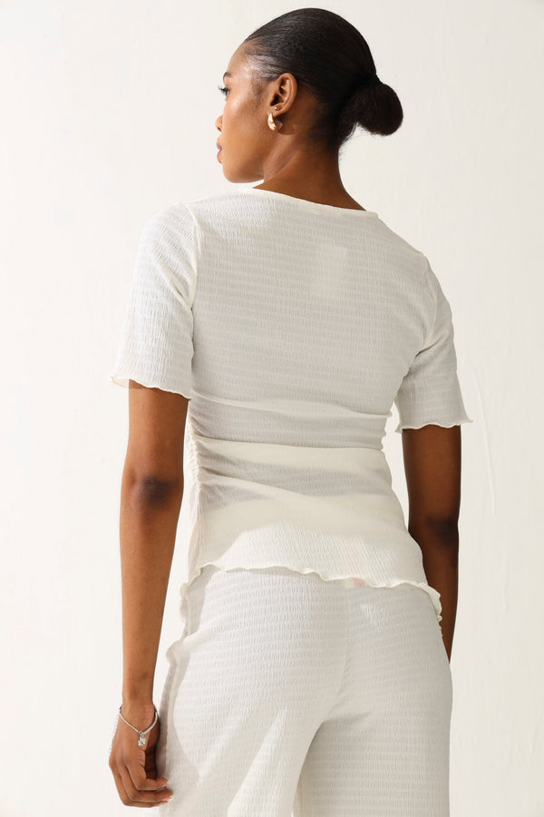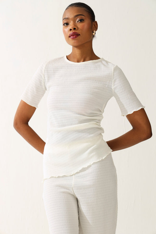 Effortlessly chic meets wonderfully textured in this asymmetrical crinkle knit top. The cream hue pairs with everything, while the crinkled fabric adds visual interest and a relaxed, lived-in vibe. That playful asymmetrical cut? It's the perfect way to shake up your everyday basics and keep your style feeling fresh and unexpected. Throw it on with jeans, layer it, or dress it up—this versatile piece does it all.