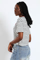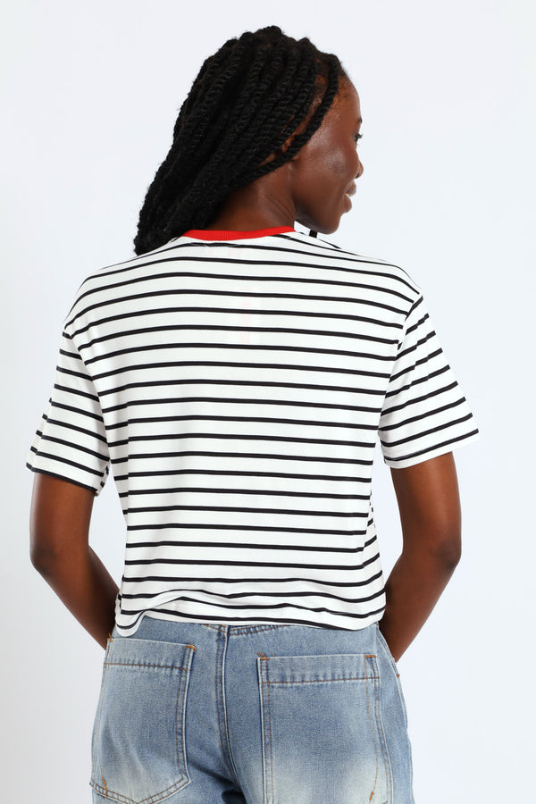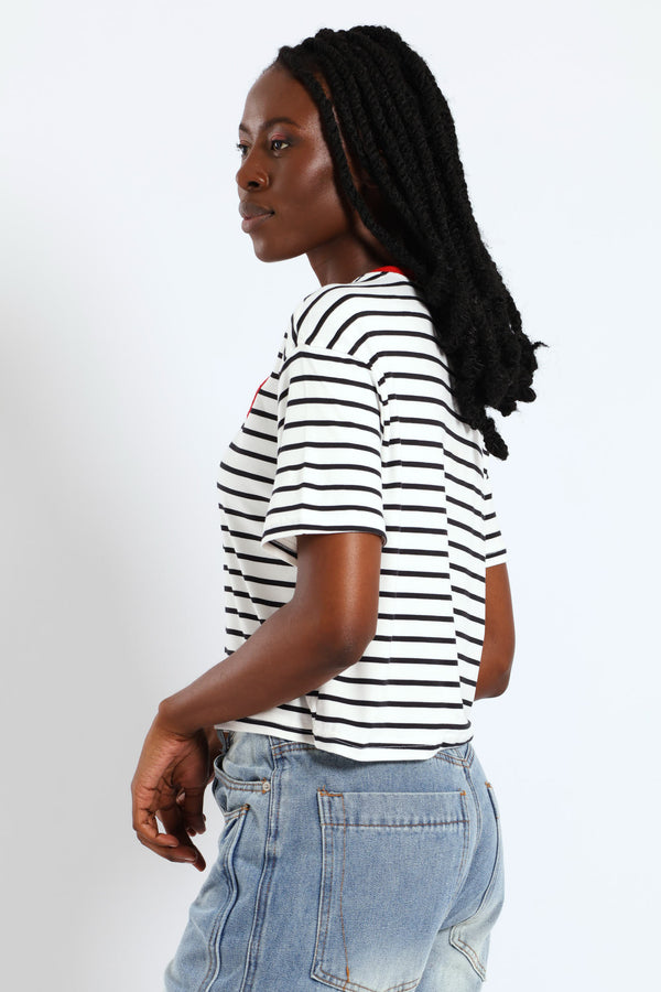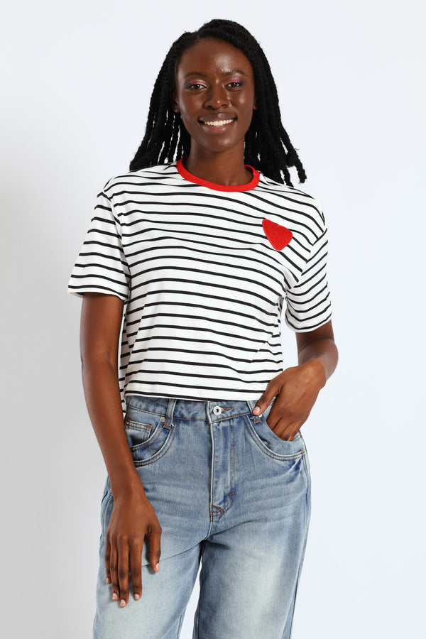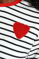 Add a splash of fun to your wardrobe with the Heart Trim Contrast Stripe Tee! Featuring bold black and white stripes with a charming heart trim, this tee pairs effortlessly with jeans or skirts for an easygoing, playful look. Soft and comfortable, it’s perfect for brightening any casual day.