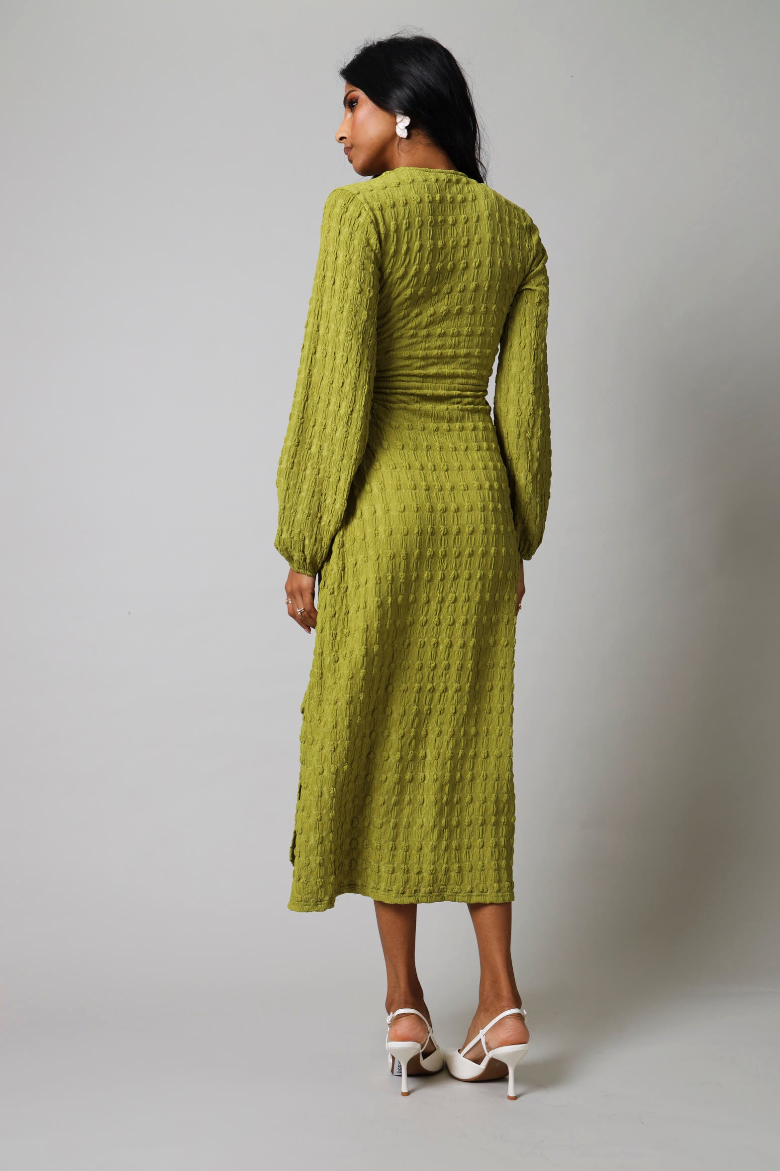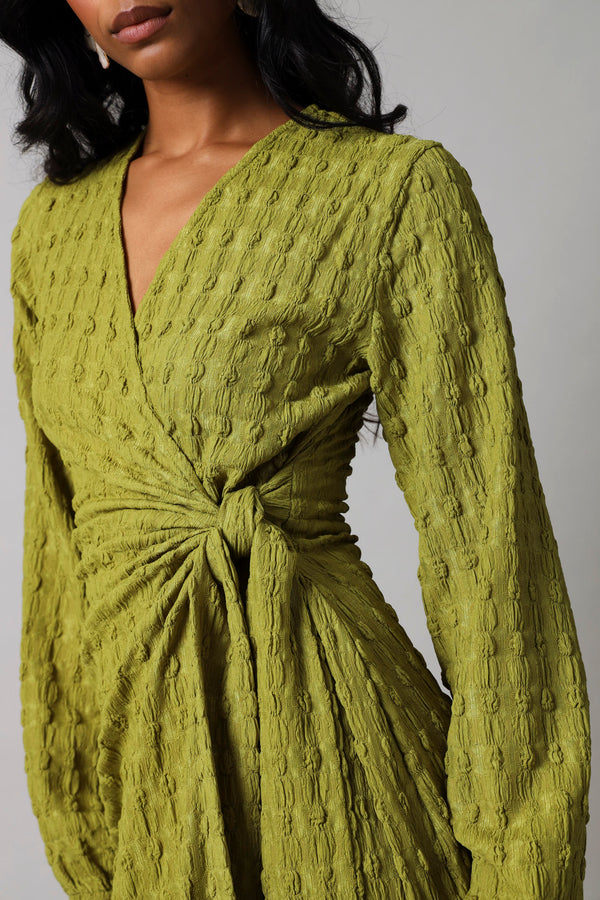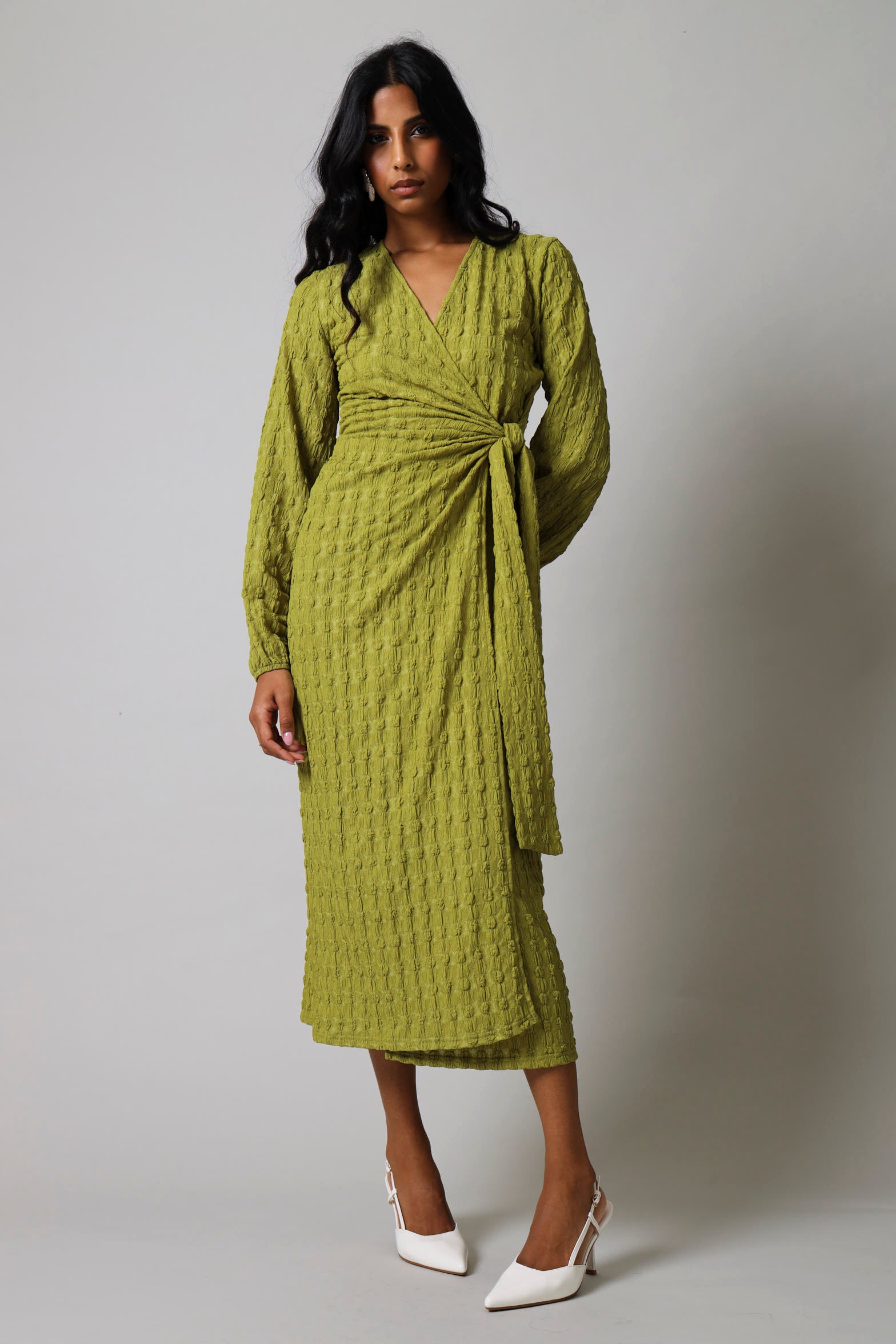 Wrap yourself in effortless elegance with this textured long-sleeve dress in gorgeous green. The flattering wrap design cinches at all the right places, while the rich texture adds depth and visual interest to your wardrobe. Perfect for transitioning from office to evening, this versatile piece pairs beautifully with heels, boots, or sneakers. Comfort meets style in a dress that's ready for whatever your day throws at you!