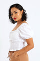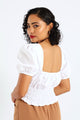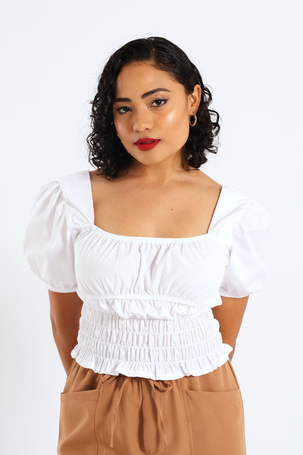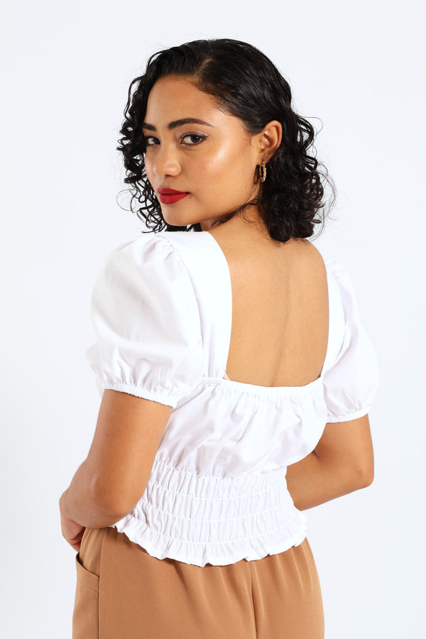 Puff Sleeve Poplin Elasticated Waist Detail Top - White