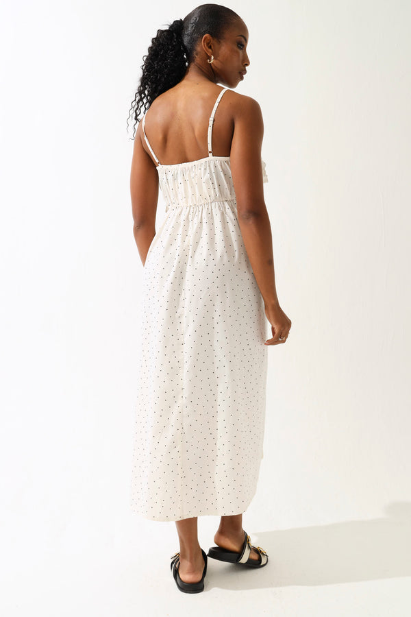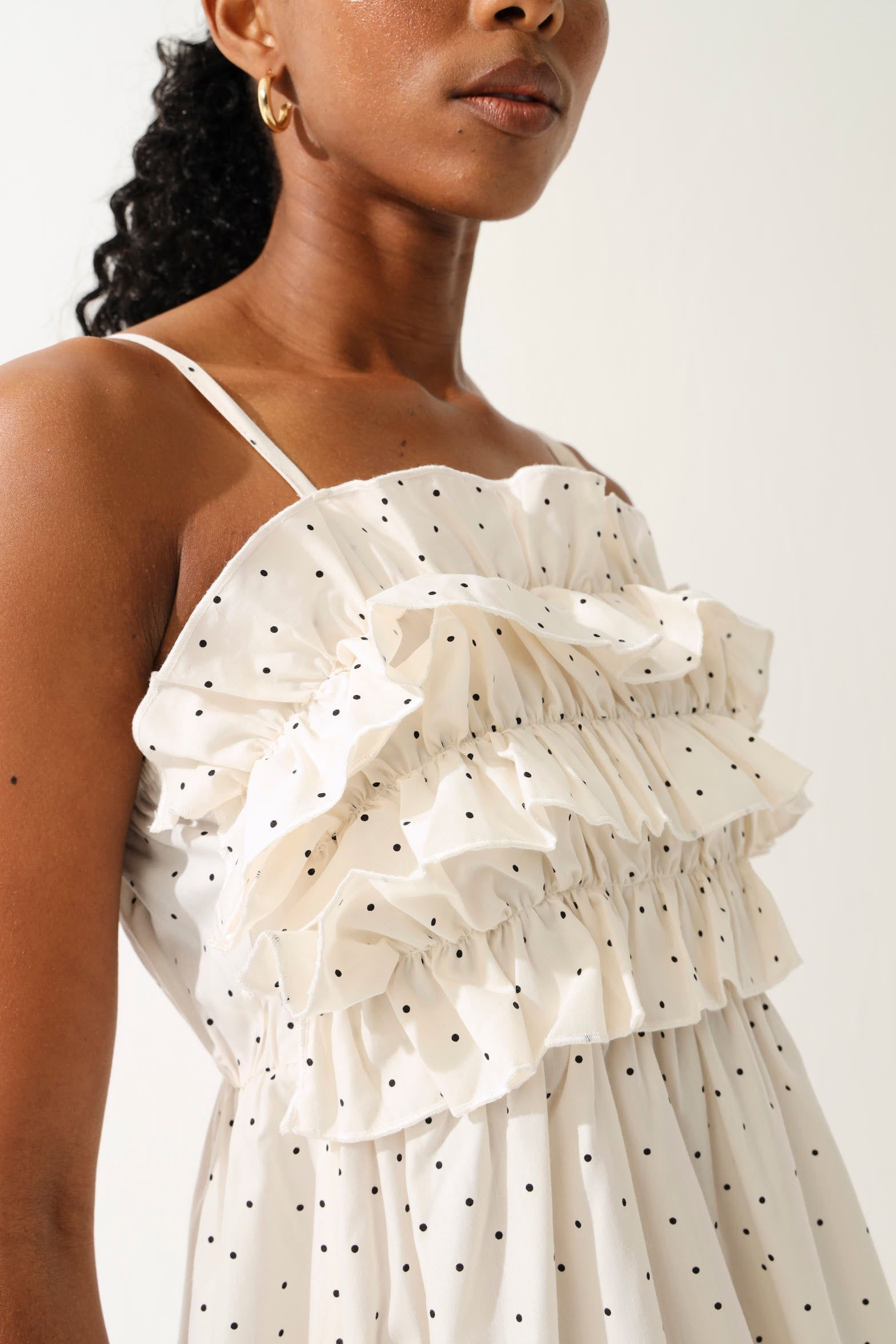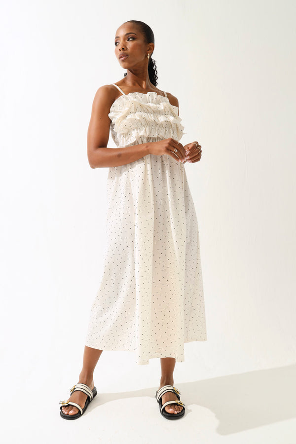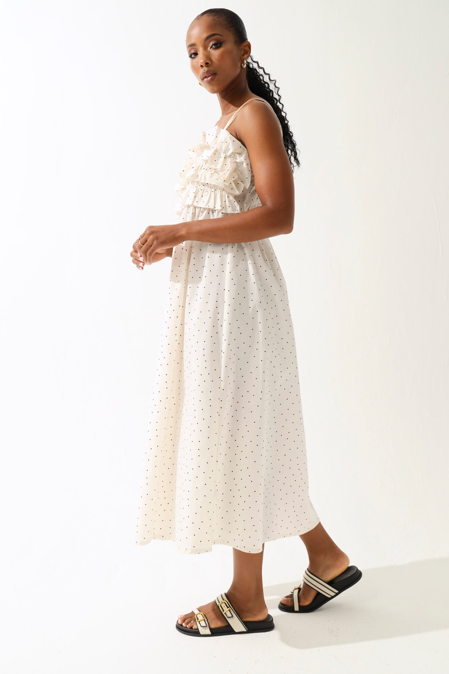 Embrace vintage-inspired charm with this ruffled bodice polka midi dress in soft beige. The delicate ruffles add romantic flair while the playful polka dot pattern brings whimsy to a timeless silhouette. The midi length offers elegant coverage with just the right amount of movement, making it perfect for everything from garden parties to casual dinners. The neutral beige backdrop keeps the look sophisticated while the ruffled details ensure you'll turn heads. Pair it with flats for a sweet daytime vibe or heels for evening elegance. Feminine, fun, and utterly charming.
