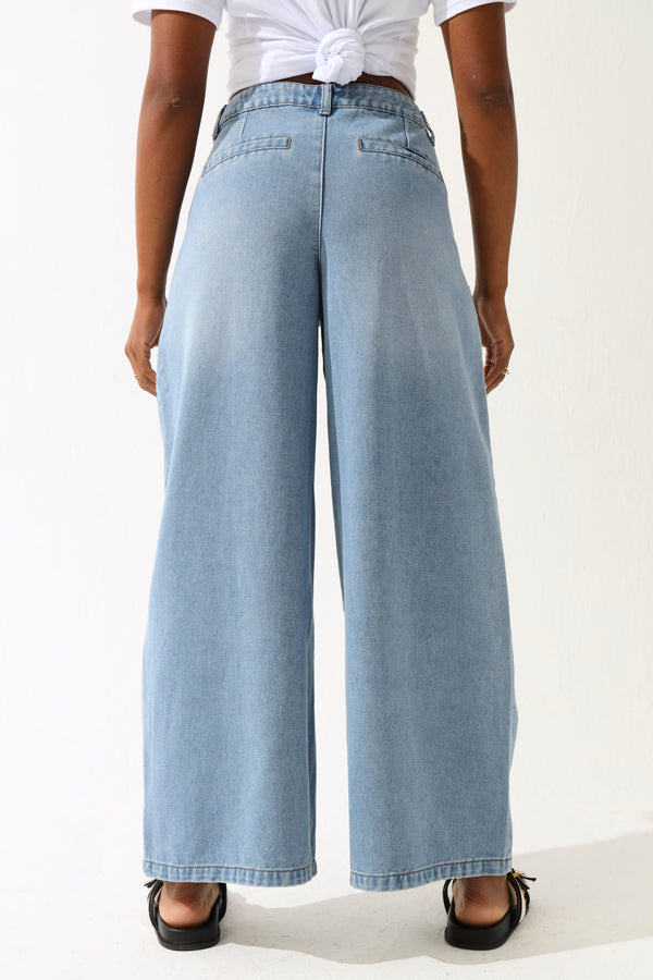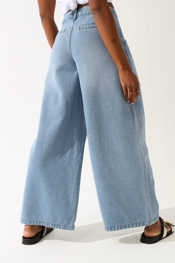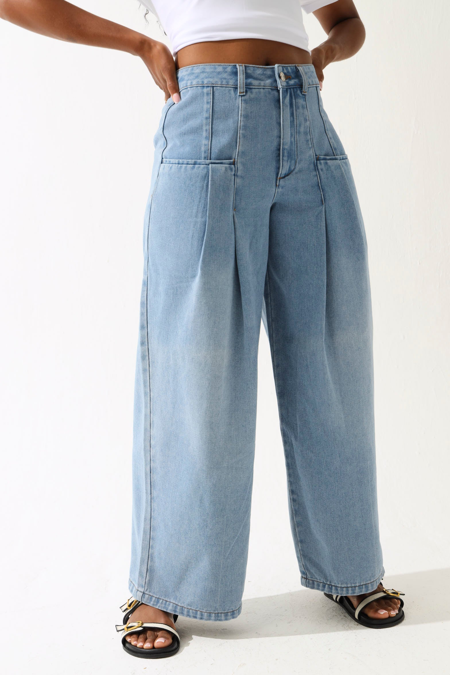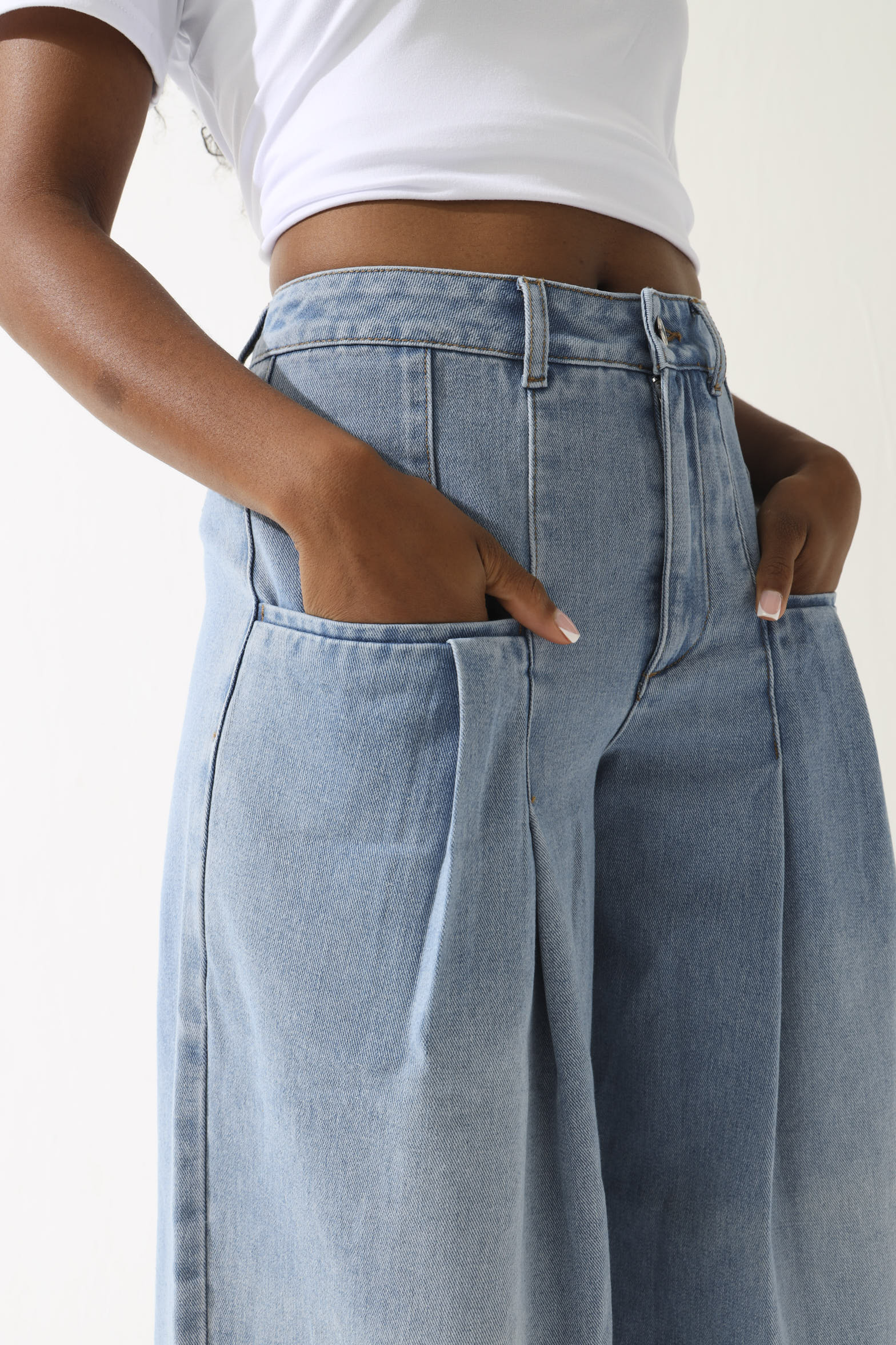 Exaggerated Pleat Pocket Wide Leg Jean - Stonewash