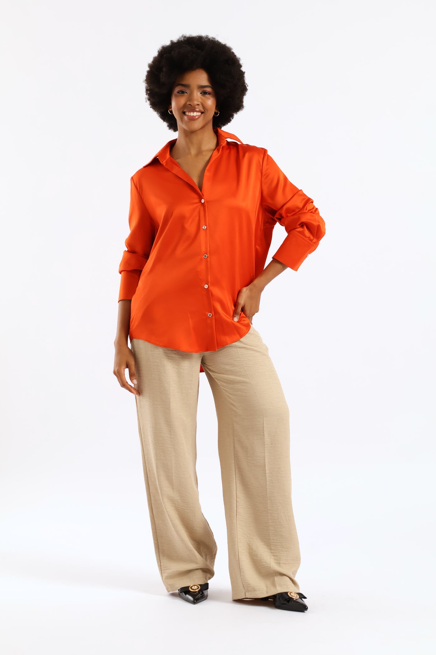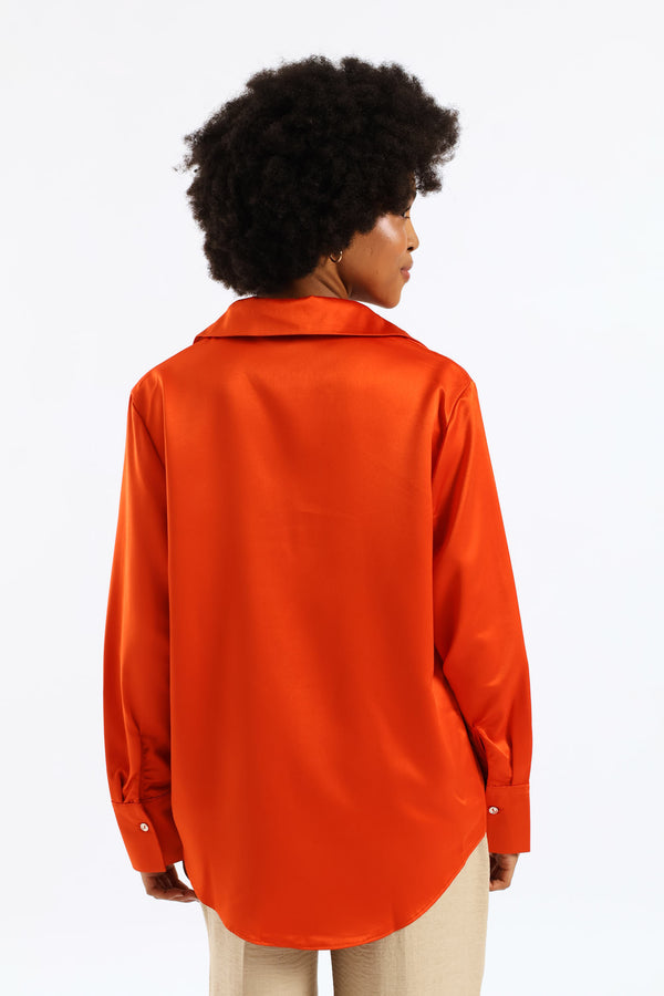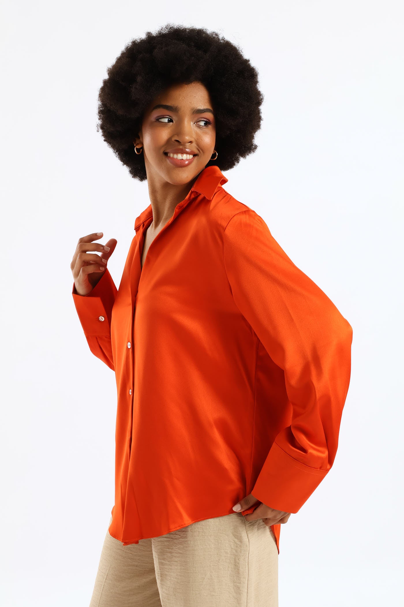 Slip into silky sophistication with this vibrant orange satin button-through shirt. The luxurious satin fabric drapes beautifully while the long sleeves offer versatile coverage for any season. Button-through styling makes it effortlessly easy to layer or wear solo, whether you're dressing up for a night out or keeping it casual. The rich orange hue brings instant personality to your wardrobe, pairing perfectly with neutrals or bold complementary colours. A wardrobe essential that feels as good as it looks.