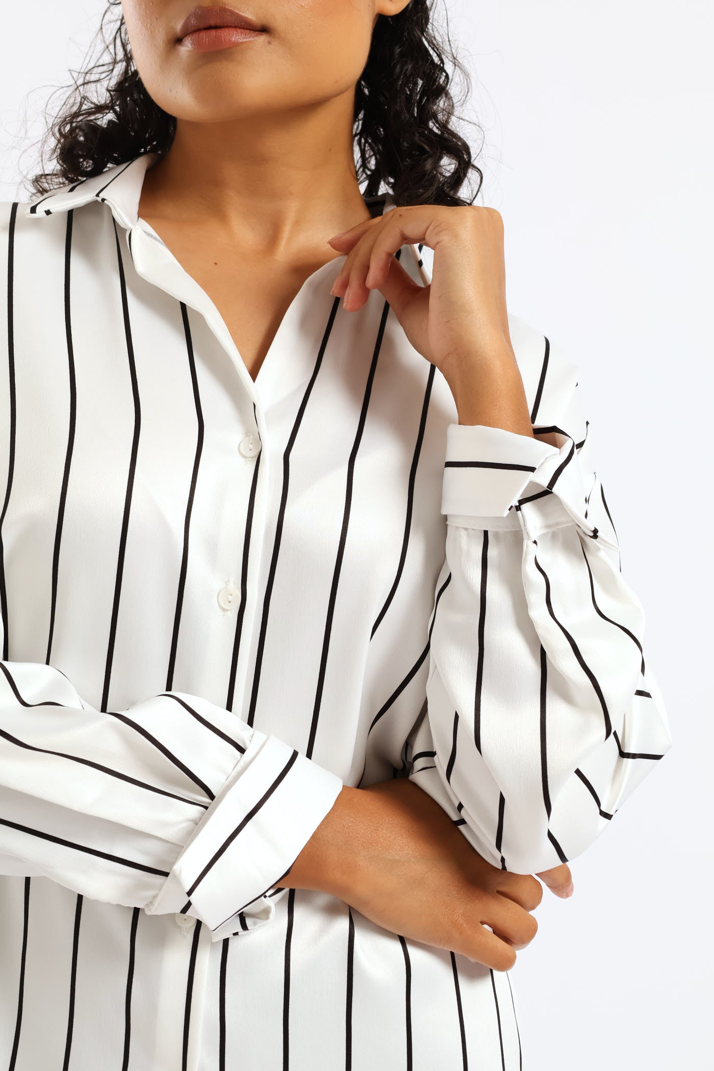 Add a dash of playful elegance with this cream and black satin stripe shirt. Its silky finish feels smooth against your skin, while the bold stripes bring a lively vibe to your look. With long sleeves and a flattering fit, it’s perfect for turning everyday moments into stylish statements.