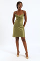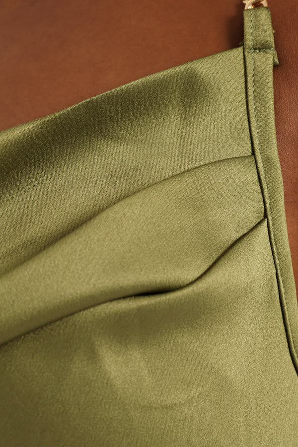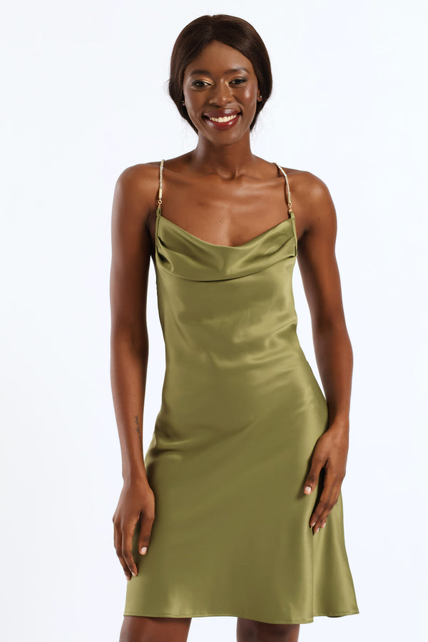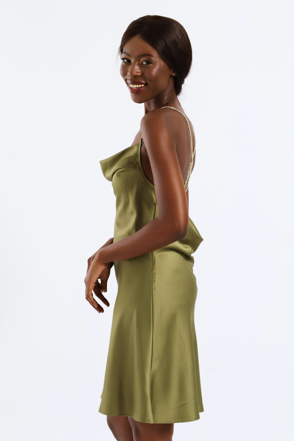 Turn heads in the Satin Diamante Strap Mini Dress in Fatigue. This playful piece brings a flirty, fun look that’s perfect for parties or nights out. The mini length keeps it cheeky while the smooth fabric feels luxe against your skin. Easy to style and impossible to ignore!