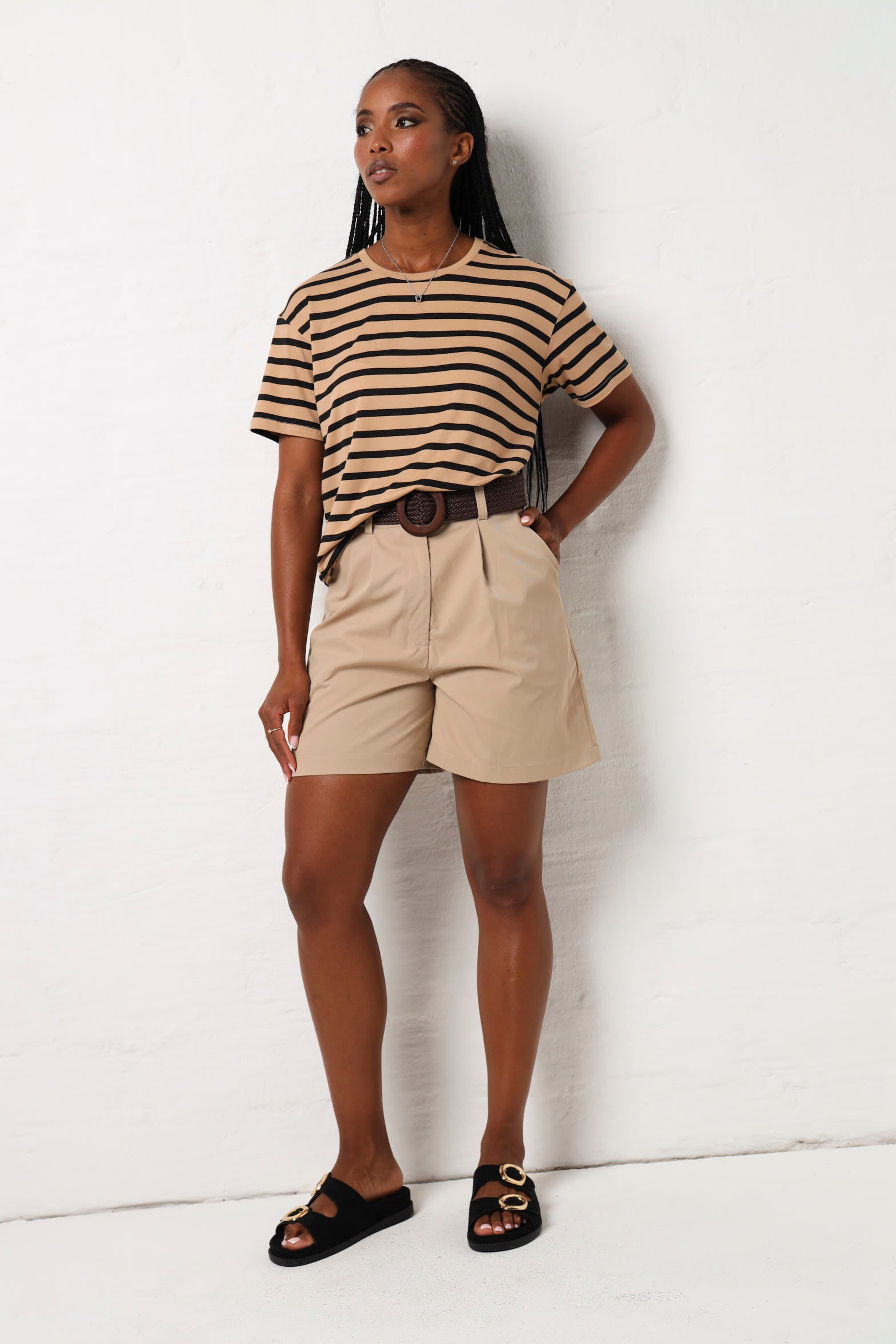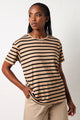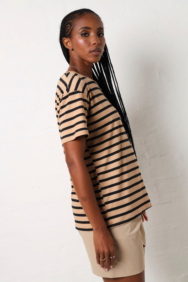 Stripes never go out of style and this tee proves it. Featuring a classic beige and black striped pattern, it's the kind of piece that pairs with everything in your wardrobe. Throw it on with jeans, shorts, or a skirt for instant effortless cool. Comfortable, versatile, and undeniably chic, this short sleeve essential is ready for whatever your day brings.