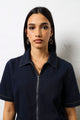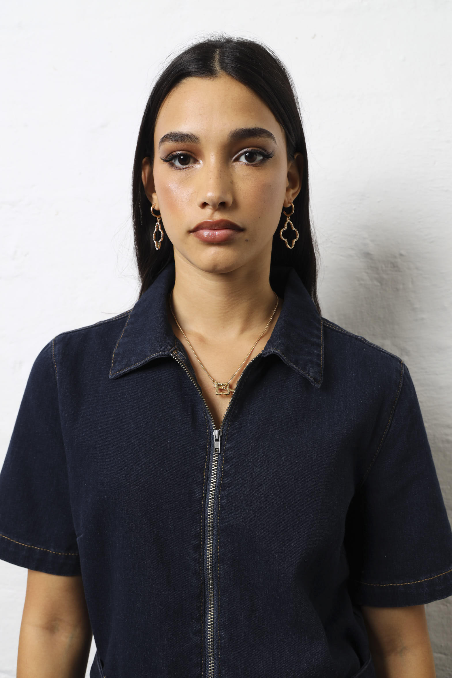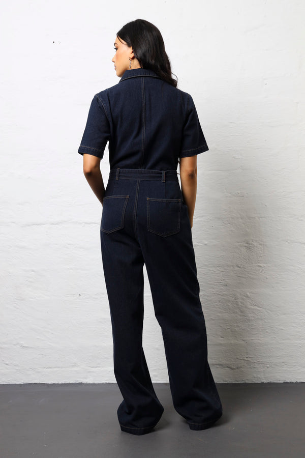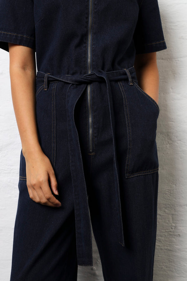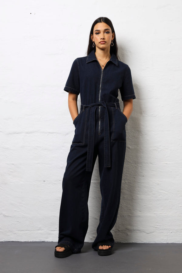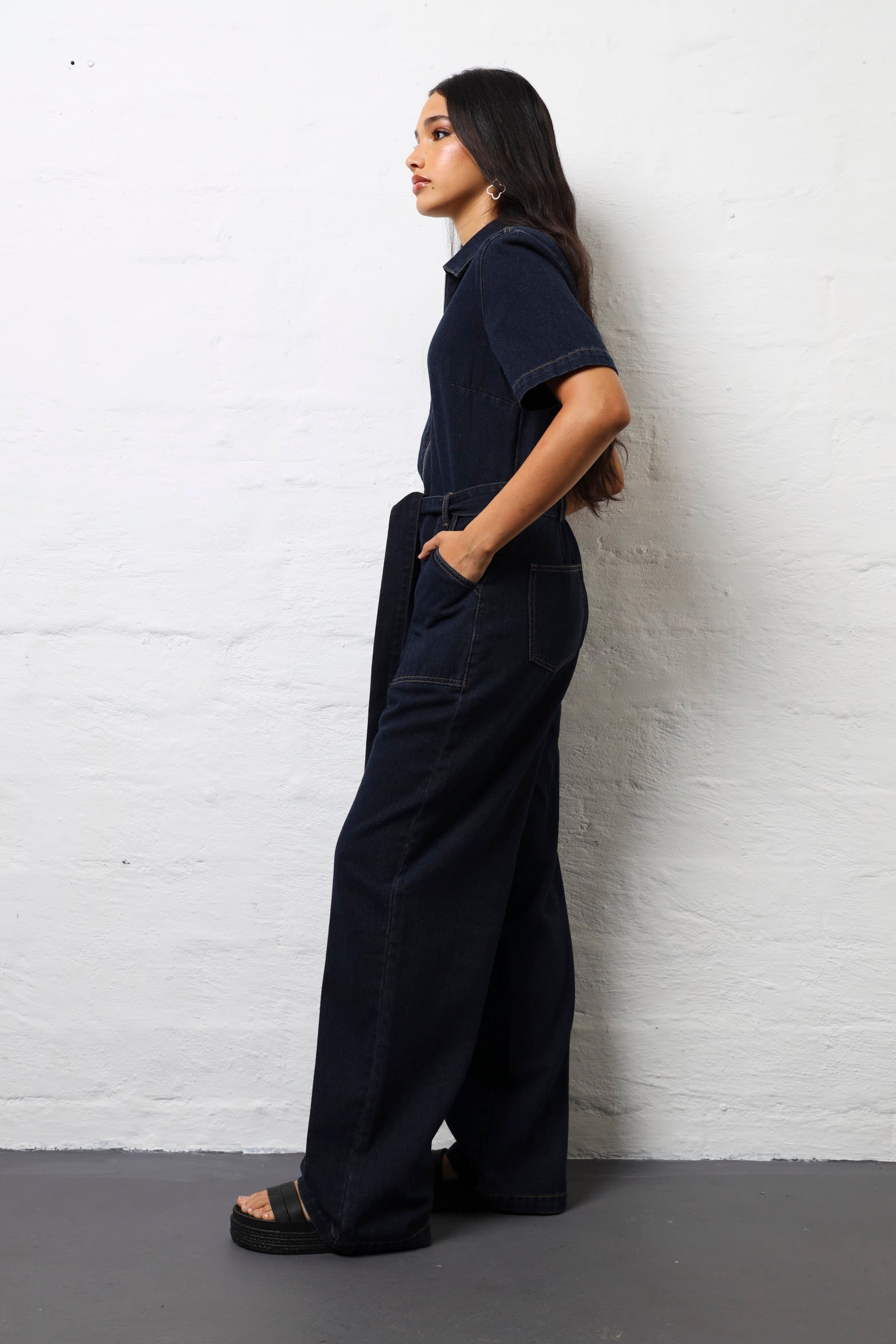 Short Sleeve Zip Front Denim Jumpsuit - Ink