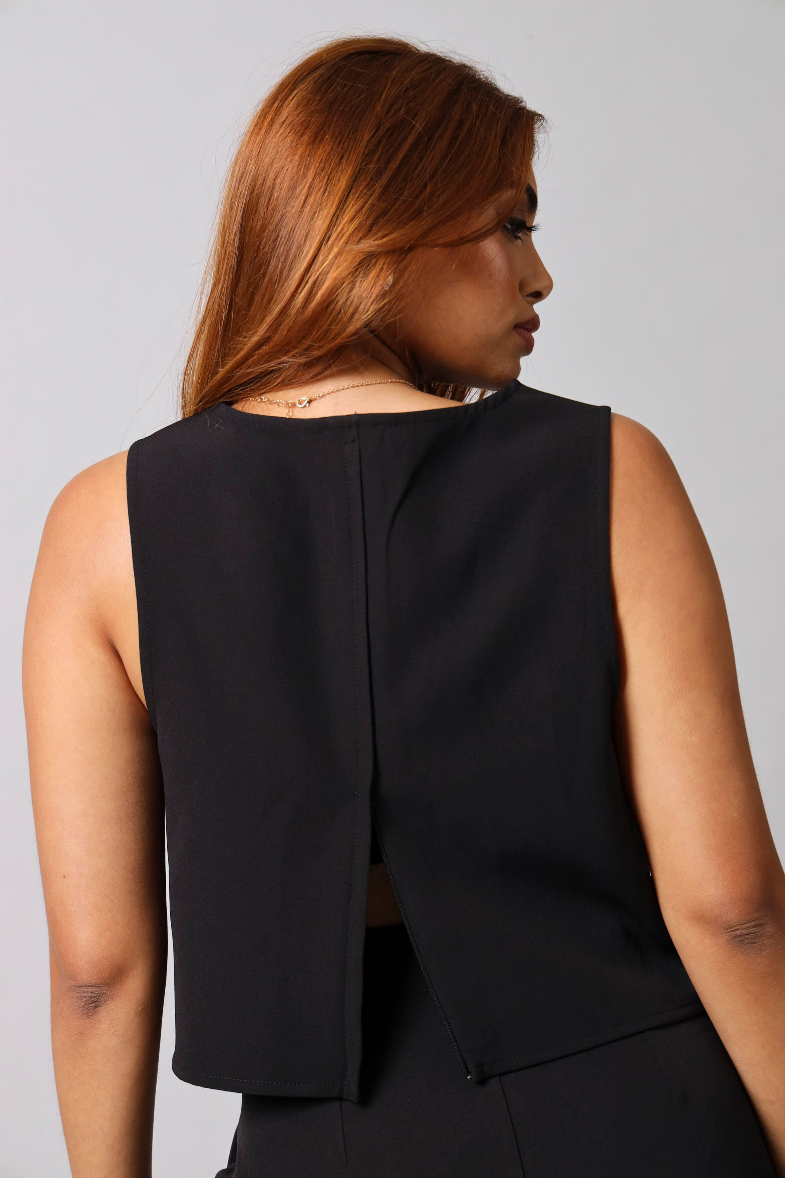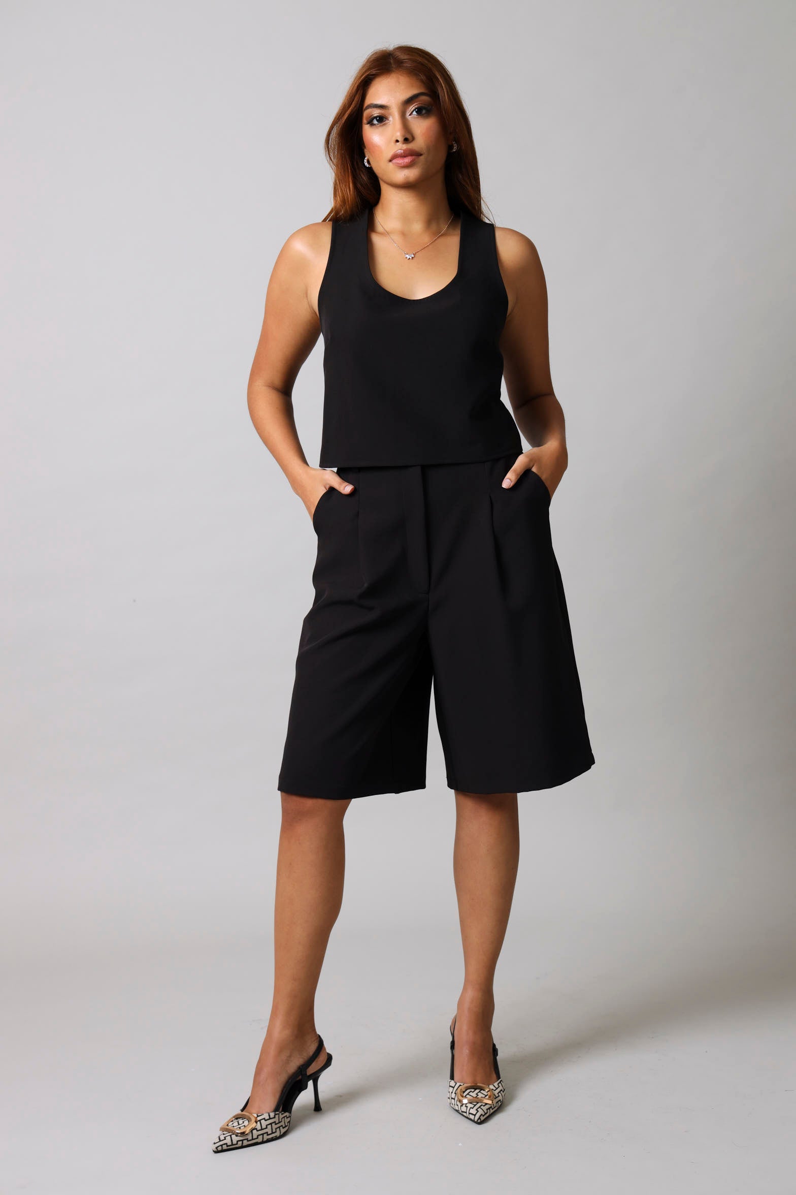 Effortless elegance meets modern edge with this sleeveless square neck top in classic black. The structured neckline frames your shoulders beautifully while the relaxed fit keeps things comfortable all day long. Perfect for layering over basics or styling solo, this versatile piece transitions seamlessly from casual weekends to dressed-up evenings. A wardrobe essential that works as hard as you do.