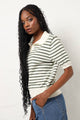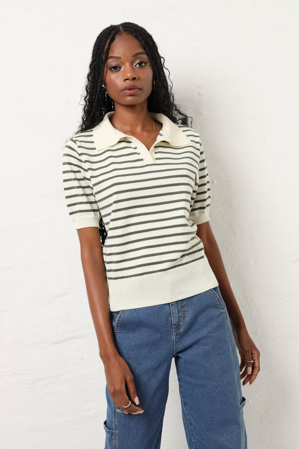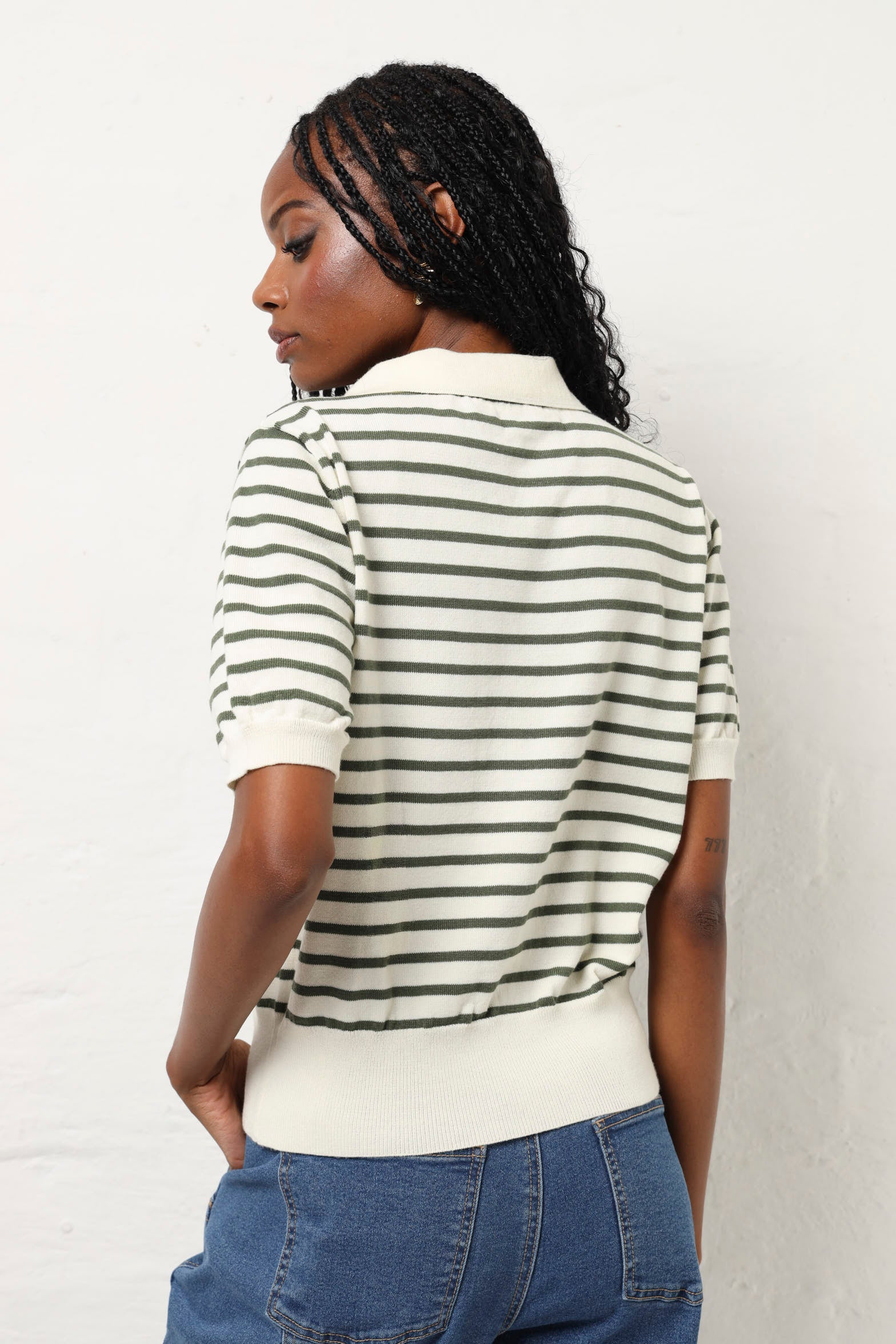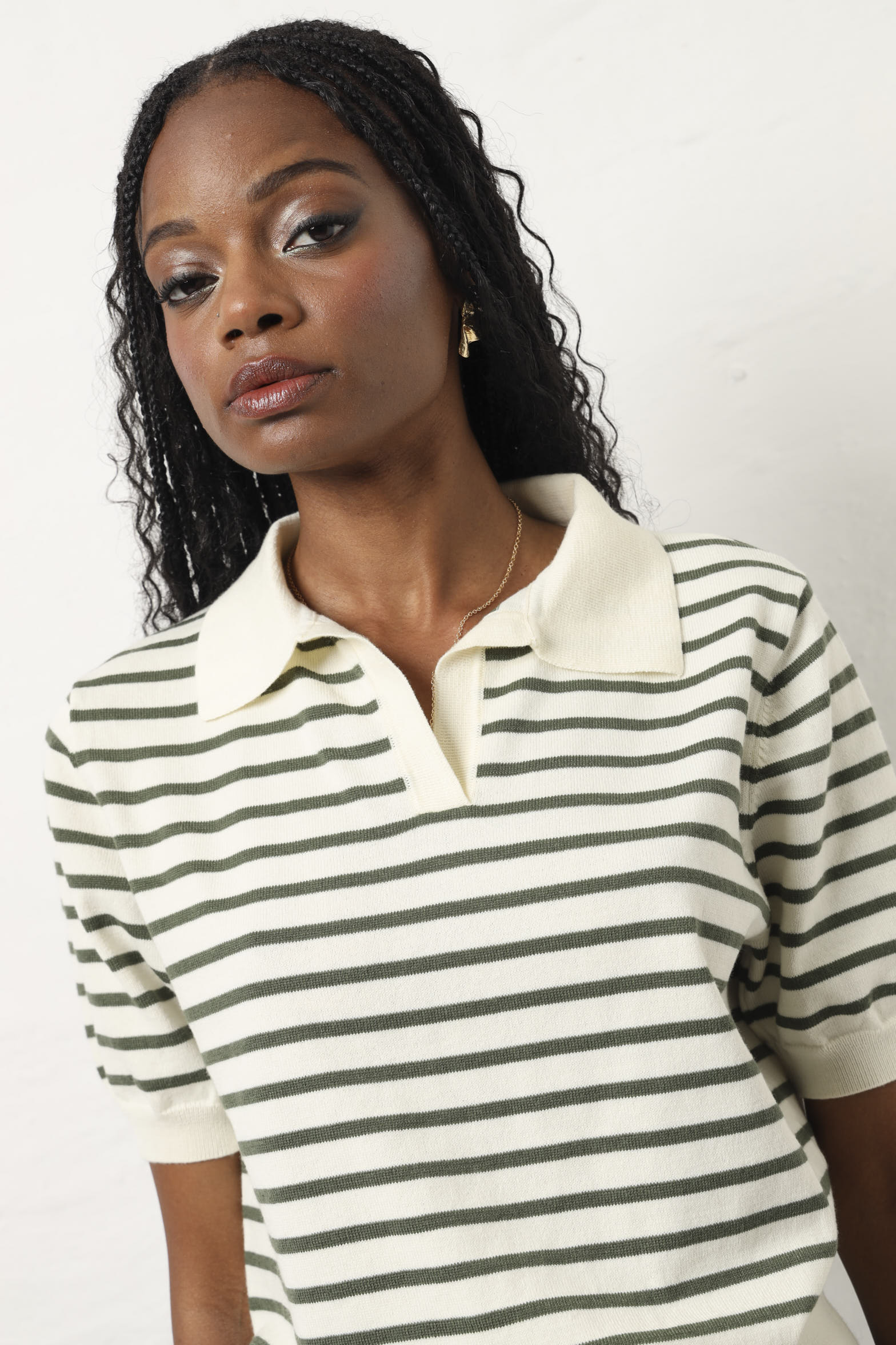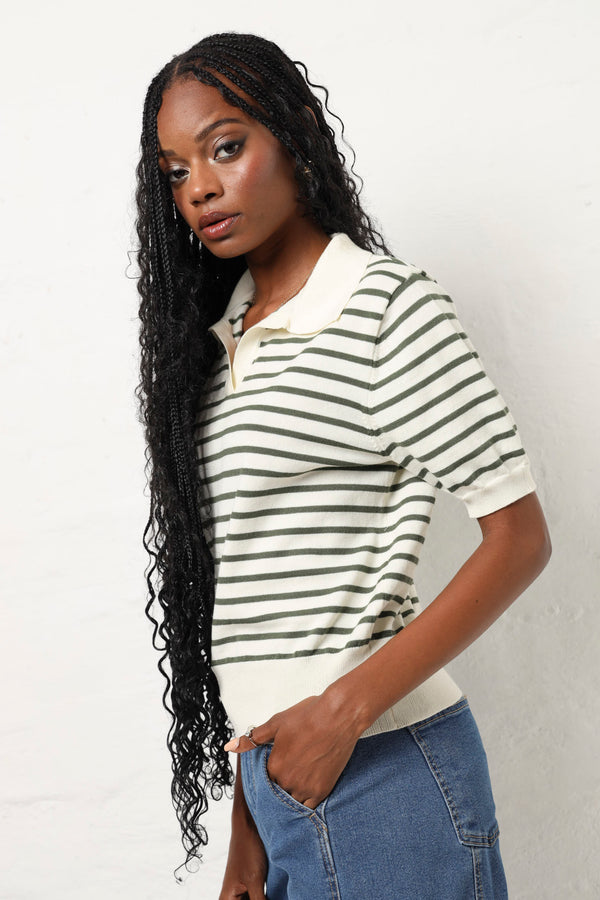 Cosy up in our Stripe Knitwear Golfer, featuring a cool fatigue and cream colour combo that's anything but boring. This relaxed pullover brings that effortless, vintage-inspired vibe with modern comfort built right in. The classic striped pattern adds visual interest while the soft knit keeps you warm and hugged all day long. Perfect for layering over a collared shirt or wearing solo with your favourite jeans, this golfer is your new weekend uniform. Whether you're catching up with mates or just keeping it low-key, this piece delivers style without the fuss. Comfort has never looked this good.