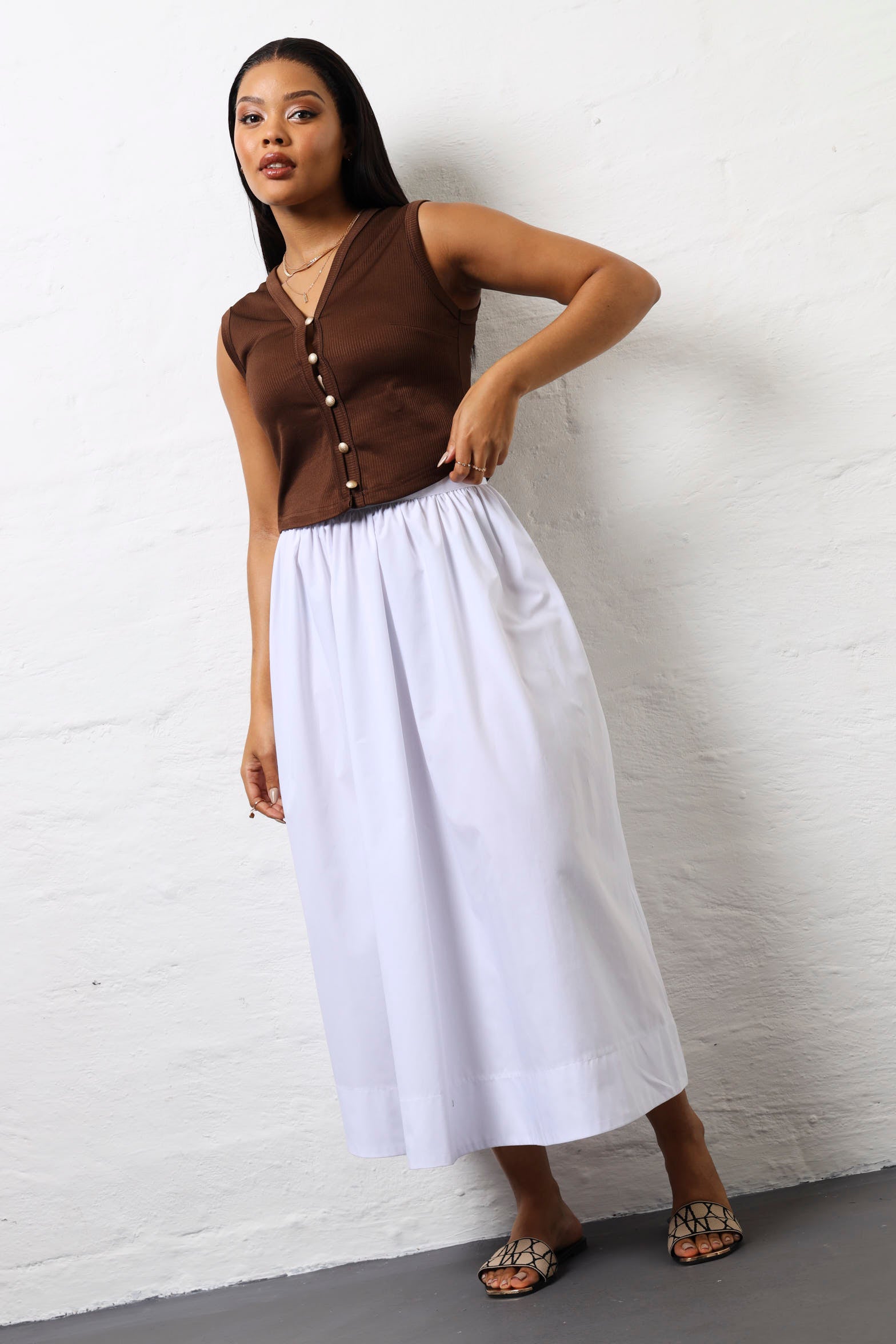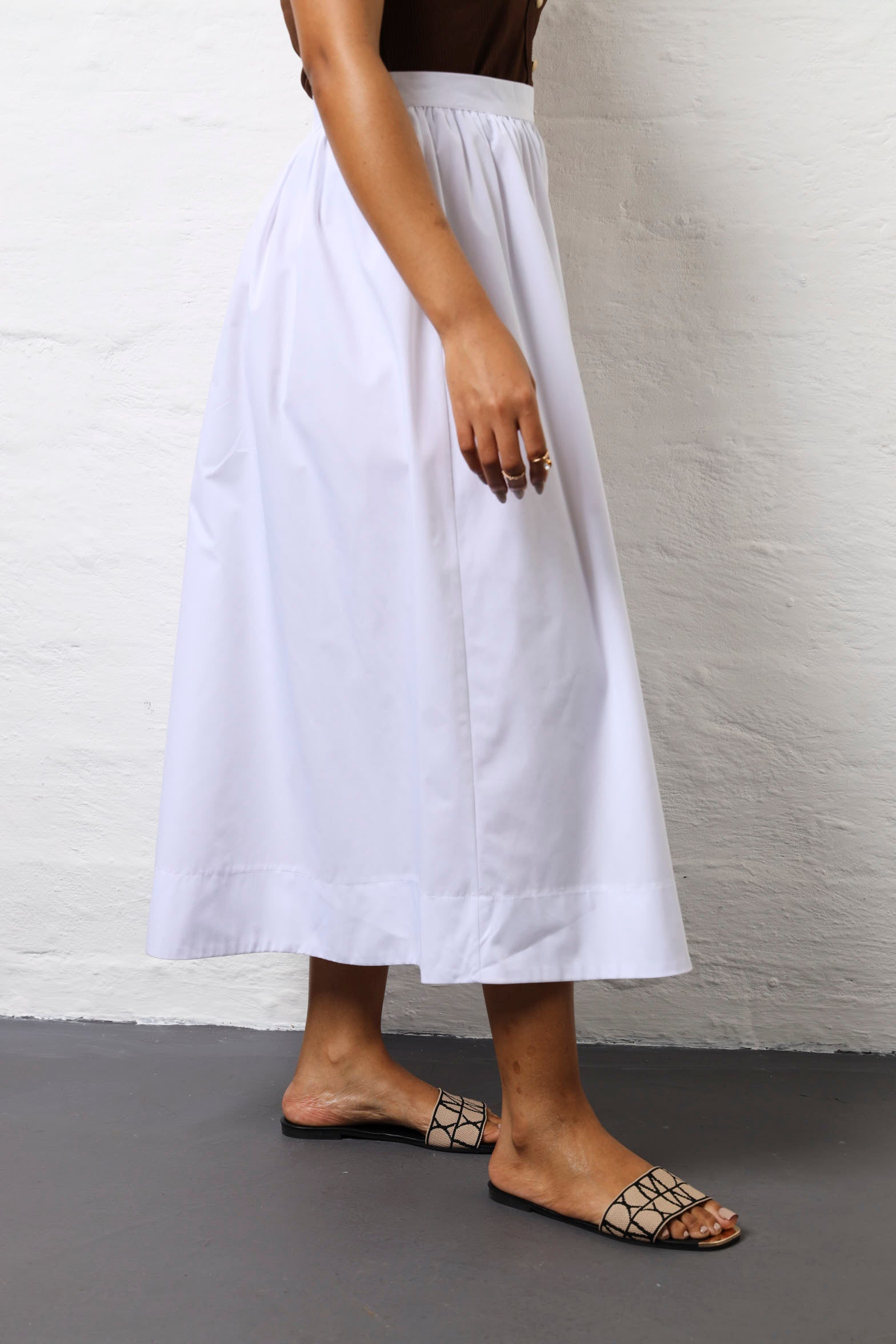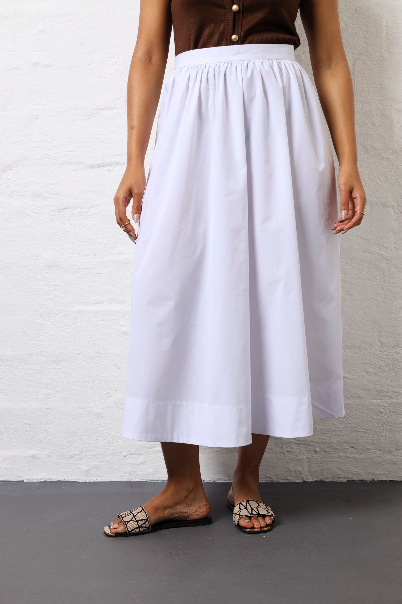 Twirl into any room in this crisp white poplin skirt that's all about fun and movement. The structured waist provides a flattering silhouette while the flared cut gives you freedom to move and groove. The clean poplin fabric keeps things fresh and polished, making it perfect for everything from casual weekends to dressier occasions. Pair it with a fitted top to show off that waistline, or go oversized for an effortlessly cool vibe. This timeless white skirt is the kind of piece that works harder than it looks—versatile, comfortable, and endlessly stylish. Your new go-to for when you want to feel fabulous without overthinking it.