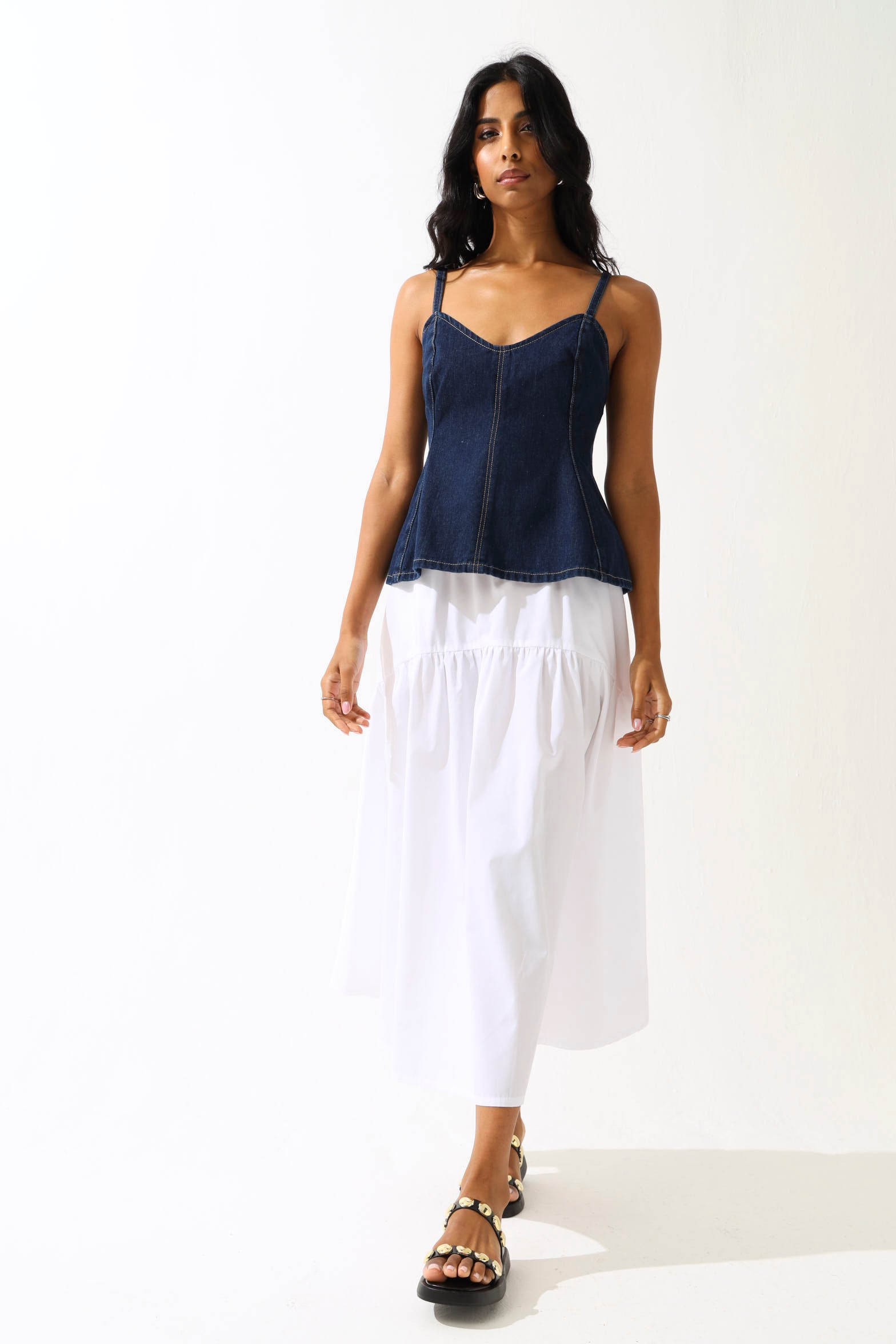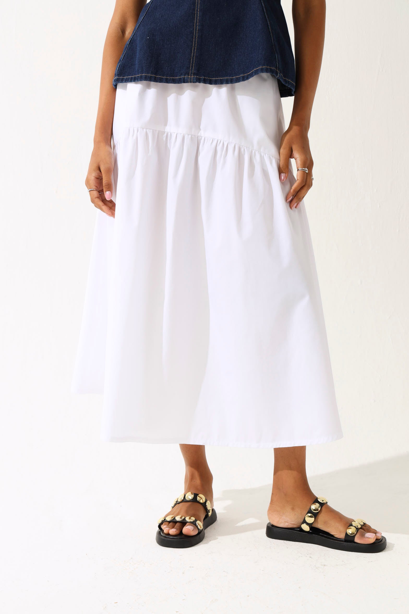 Effortless volume meets timeless elegance. This tiered elasticated poplin midi skirt is your answer to looking put-together without the fuss—the crisp white poplin fabric holds its shape beautifully while the tiered layers add movement and dimension that flatters every frame. The elasticated waist means comfort that actually feels like comfort, so you can wear it all day without thinking twice. From casual brunch to garden parties to office-appropriate occasions, this skirt transitions seamlessly across your week. The midi length keeps things sophisticated while the playful tiers remind everyone you're not afraid to have fun with fashion.
