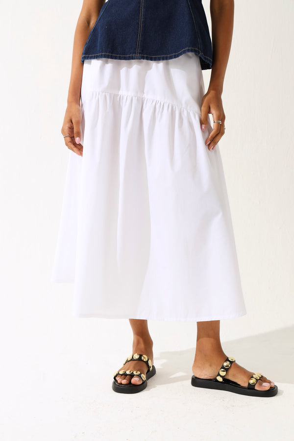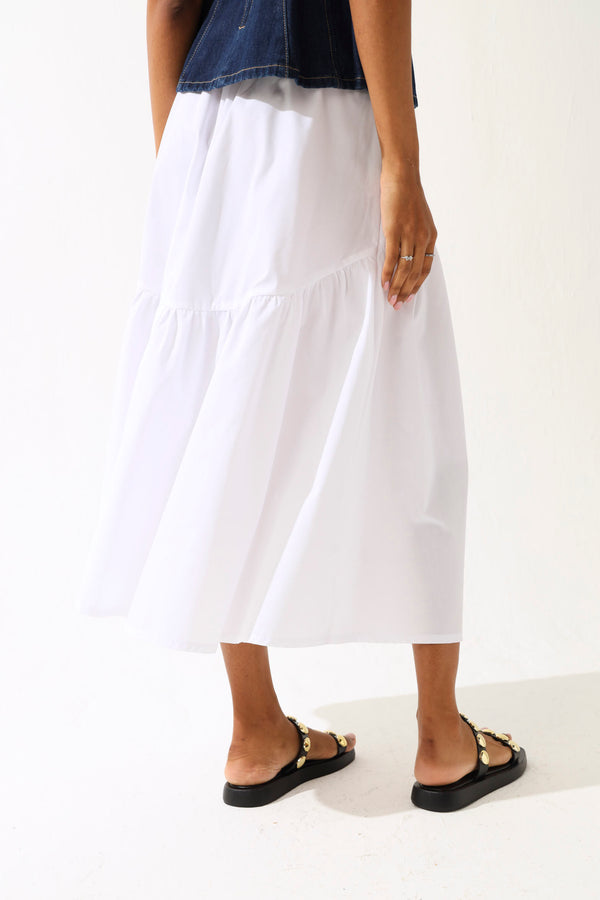 Tiered Elasticated Poplin Midi Skirt - White