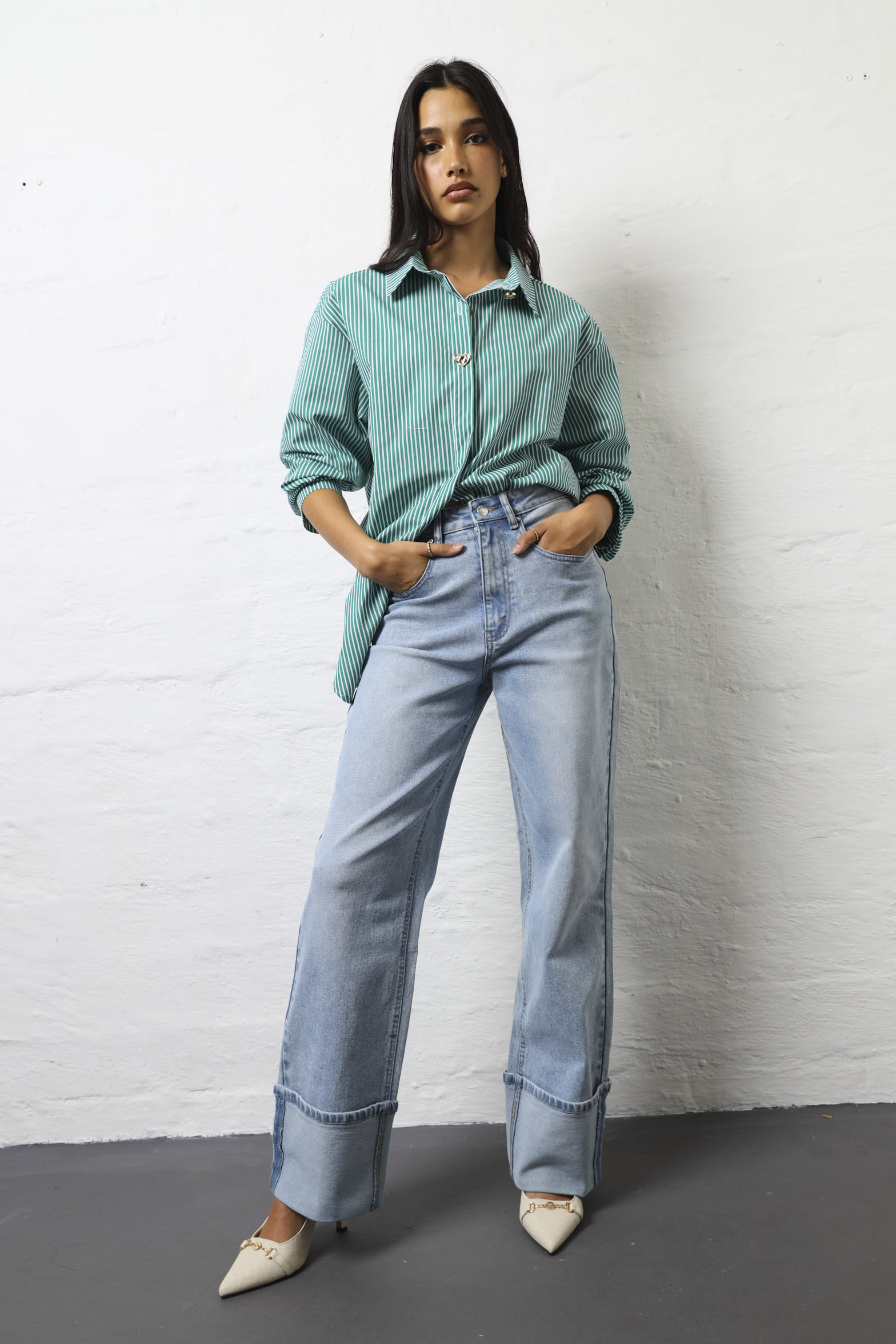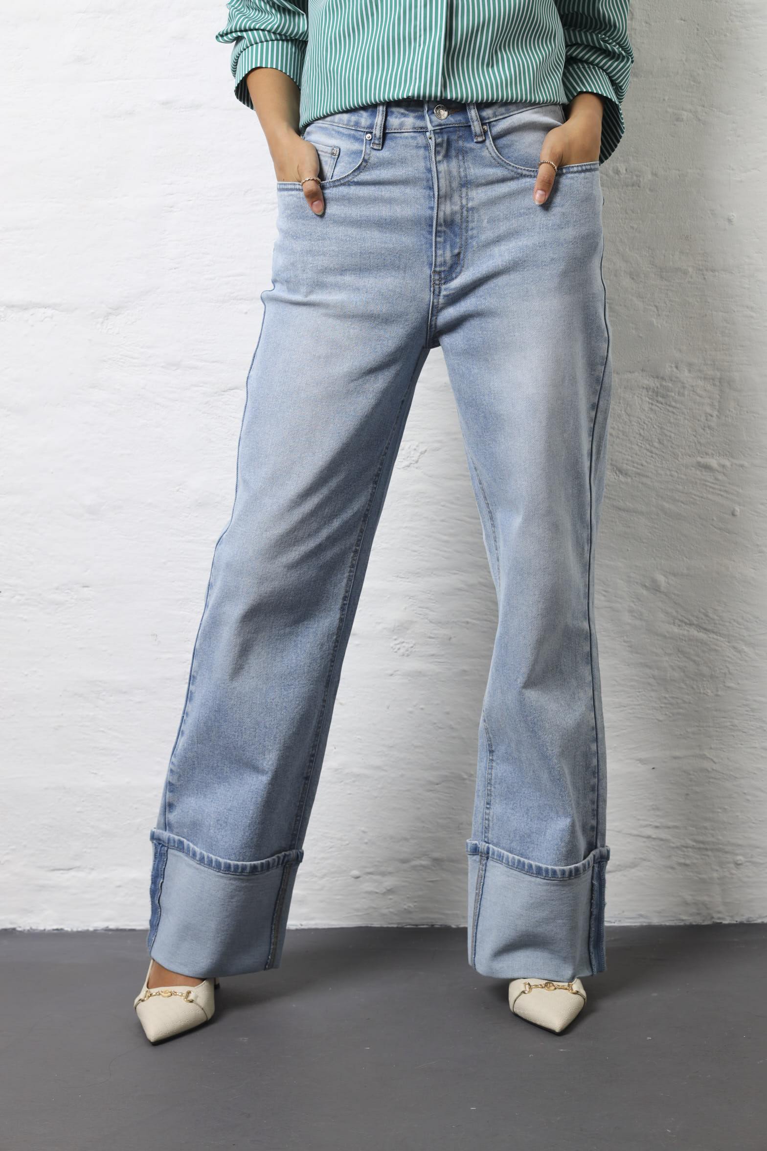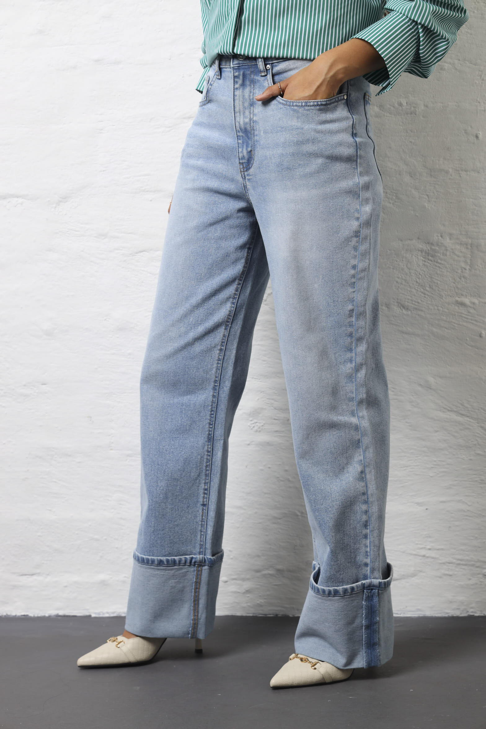 Step into effortless cool with these light wash wide-leg jeans featuring a cheeky turn-up detail that's equal parts retro and modern. The relaxed wide-leg silhouette is incredibly flattering and comfortable, giving you room to move while looking absolutely fabulous. The turn-up hem adds a playful touch that shows off your favourite shoes and brings a vintage-inspired vibe to your everyday style. Perfect for pairing with everything from oversized tees to fitted tops, these jeans are your new wardrobe MVP. The light wash keeps things fresh and versatile, working beautifully for casual weekends or dressed-up occasions. Whether you're channelling 90s nostalgia or simply want jeans that feel as good as they look, these wide-legs deliver comfort and style without compromise. Because the best jeans are the ones you never want to take off.