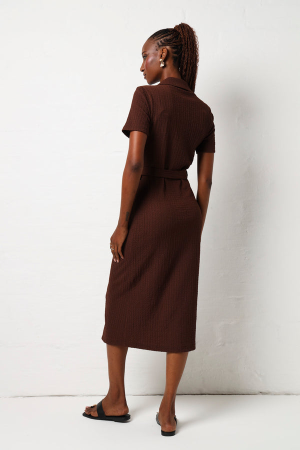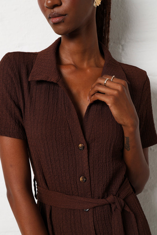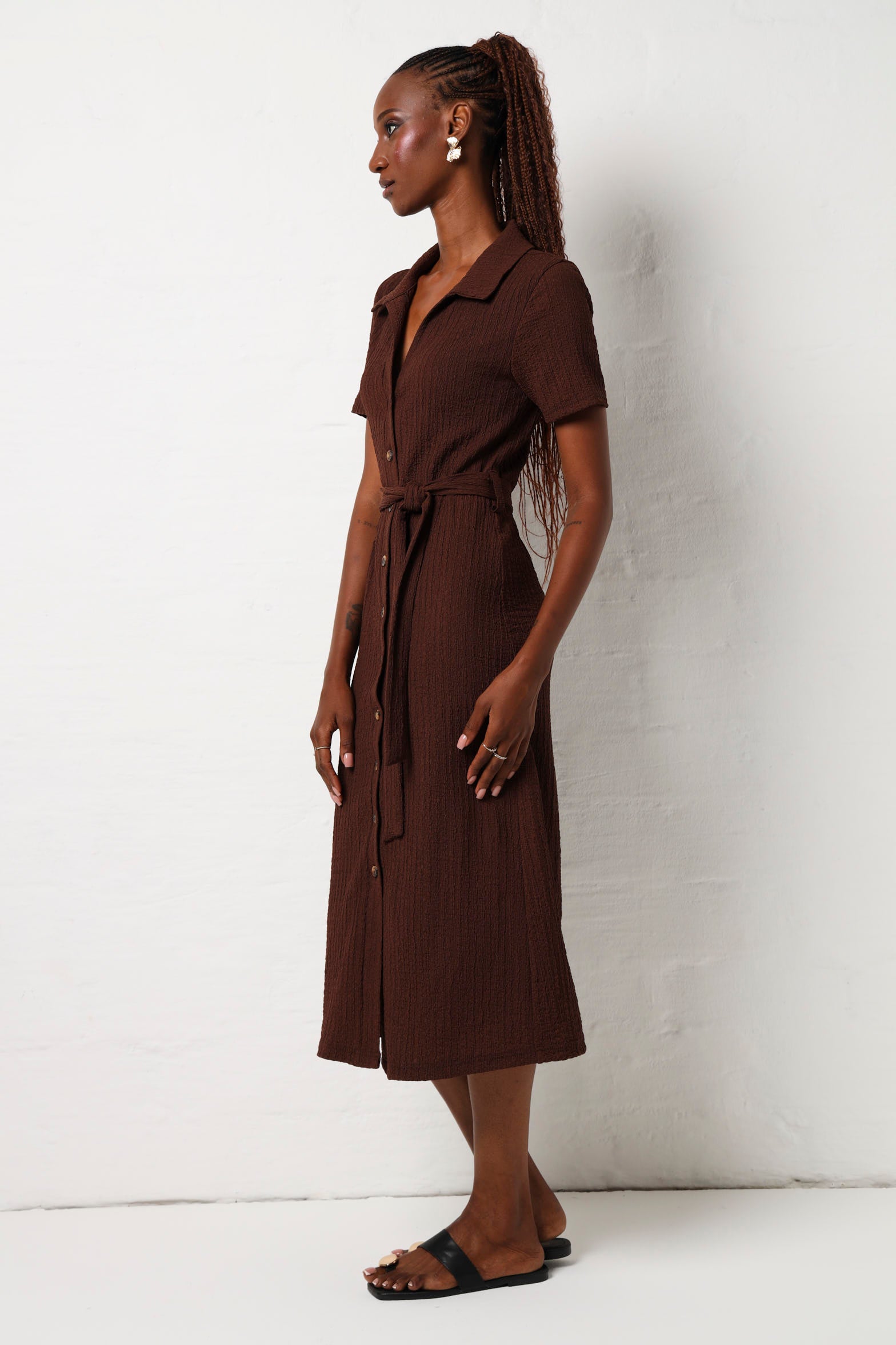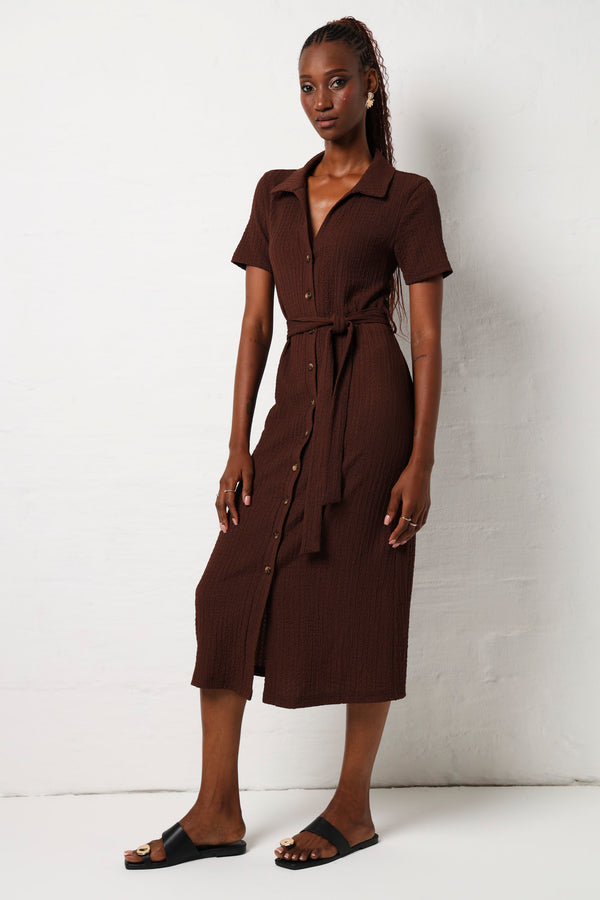 Crinkle Knit Belted Shirt Dress - Chocolate