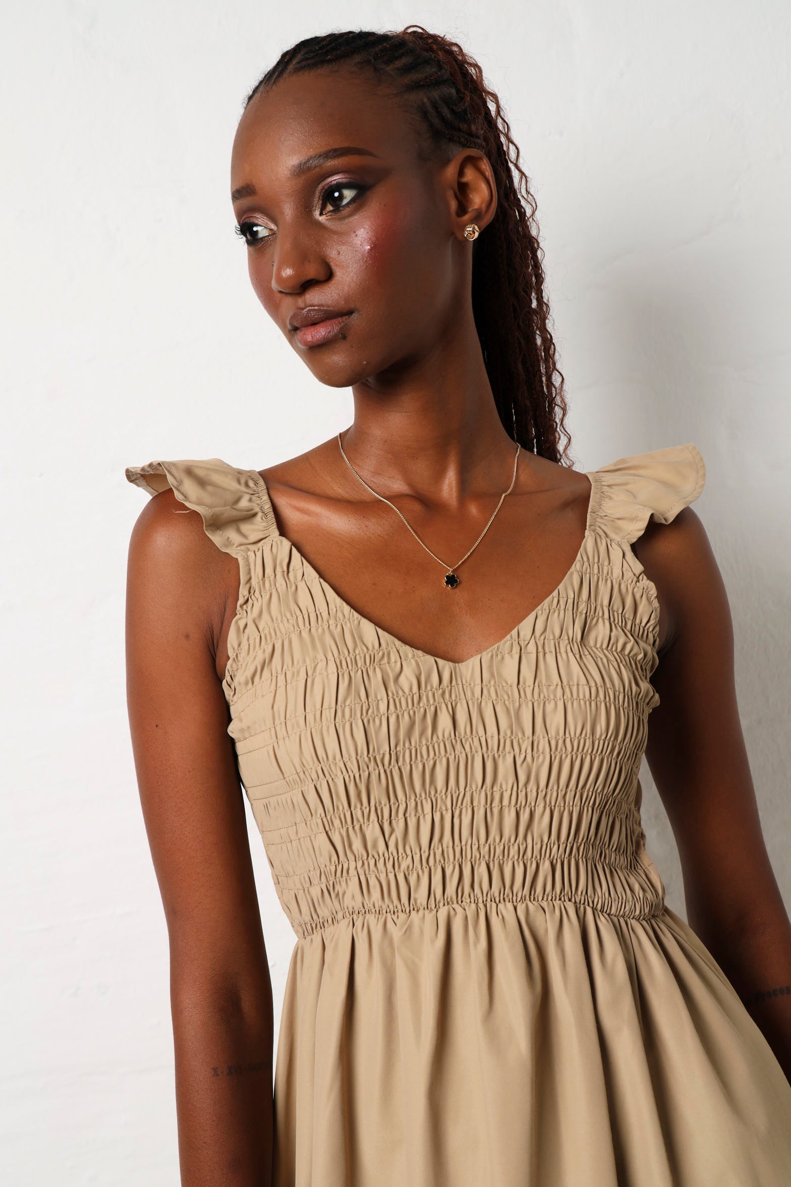 Twirl into elegance with this stunning maxi dress that's equal parts romantic and effortless. The delicate frill sleeves add a whimsical touch, while the shirred bodice creates a flattering, sculpted silhouette that moves beautifully with you. Crafted in a versatile stone hue, this dress transitions seamlessly from daytime adventures to evening occasions. Perfect for those who want to make a statement without trying too hard—because looking this good should feel like second nature.