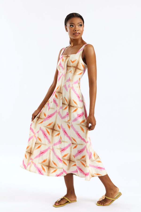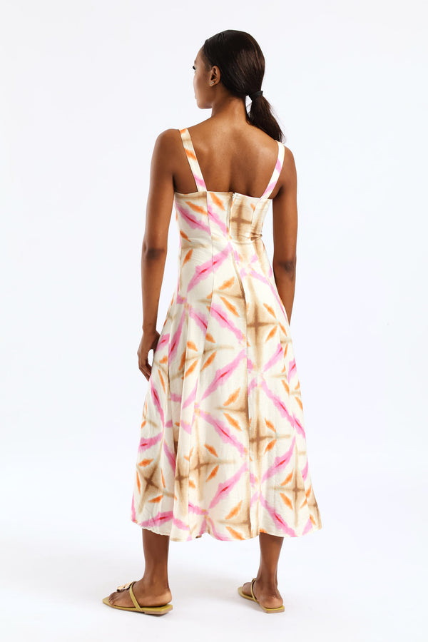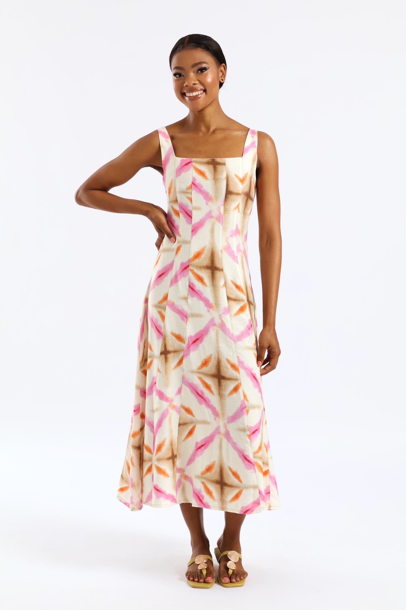 Printed Linen Look Fit And Flare Midi Dress - Multi