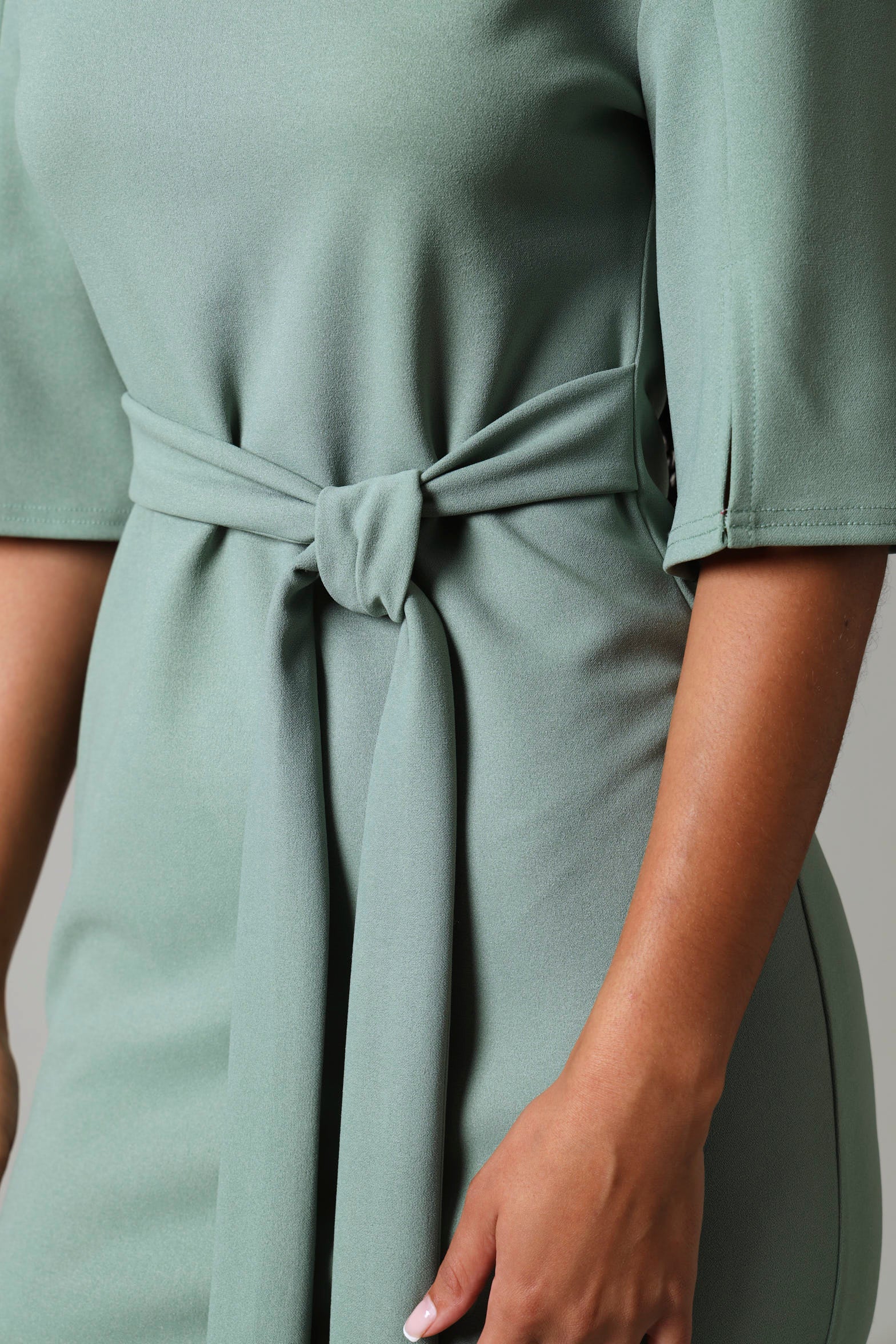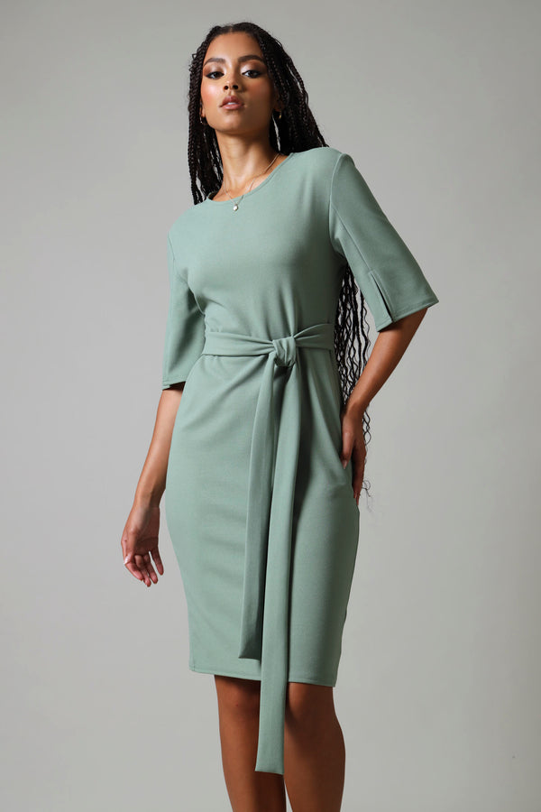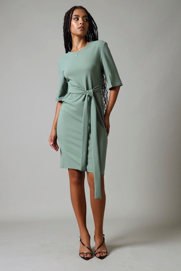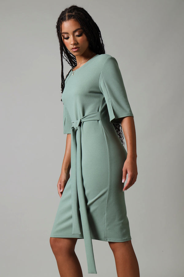 This sage bodycon dress showcases refined elegance through its thoughtfully designed short sleeves with dramatic flare slits. The streamlined silhouette hugs gracefully while the textured sleeve detail introduces contemporary sophistication. Perfect for those who appreciate understated luxury, this piece transitions effortlessly from professional settings to evening occasions, offering versatile styling possibilities with its calming, neutral tone.