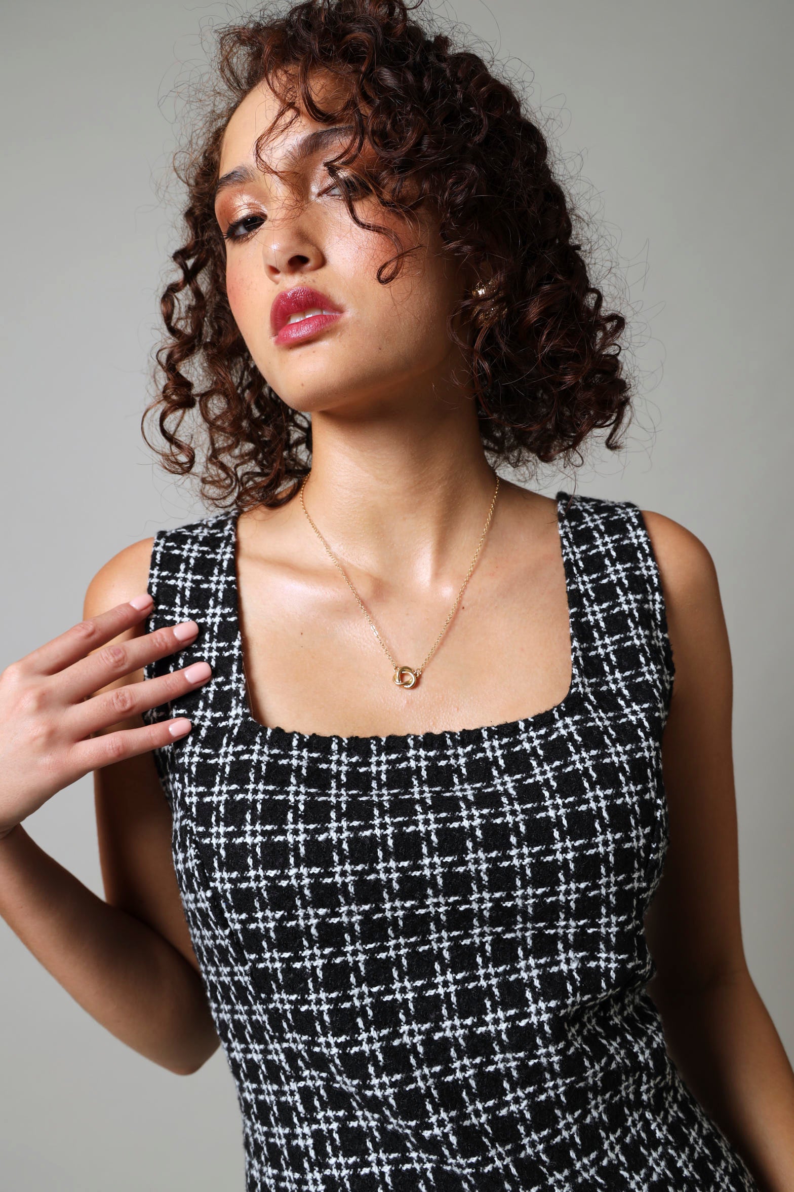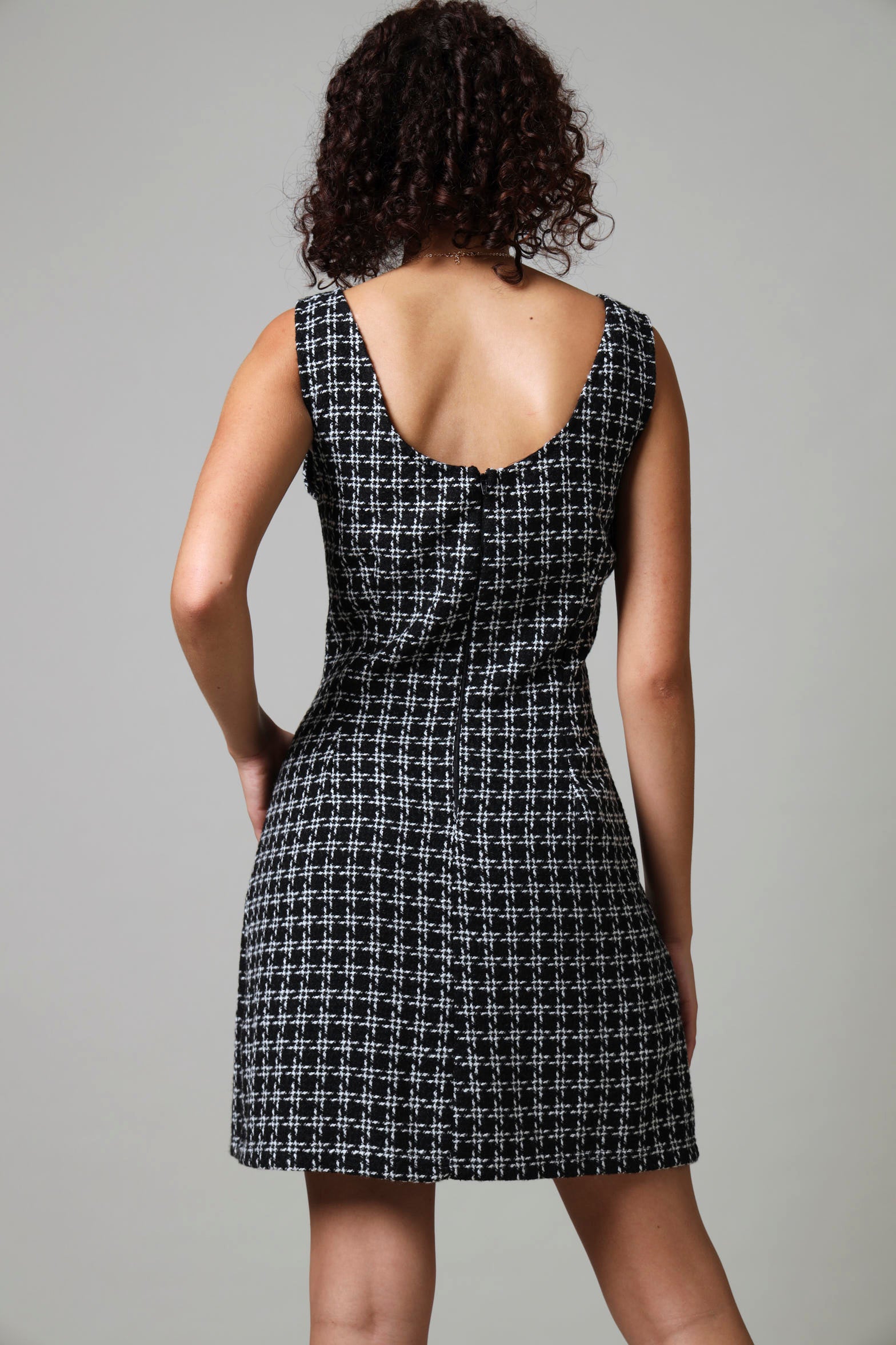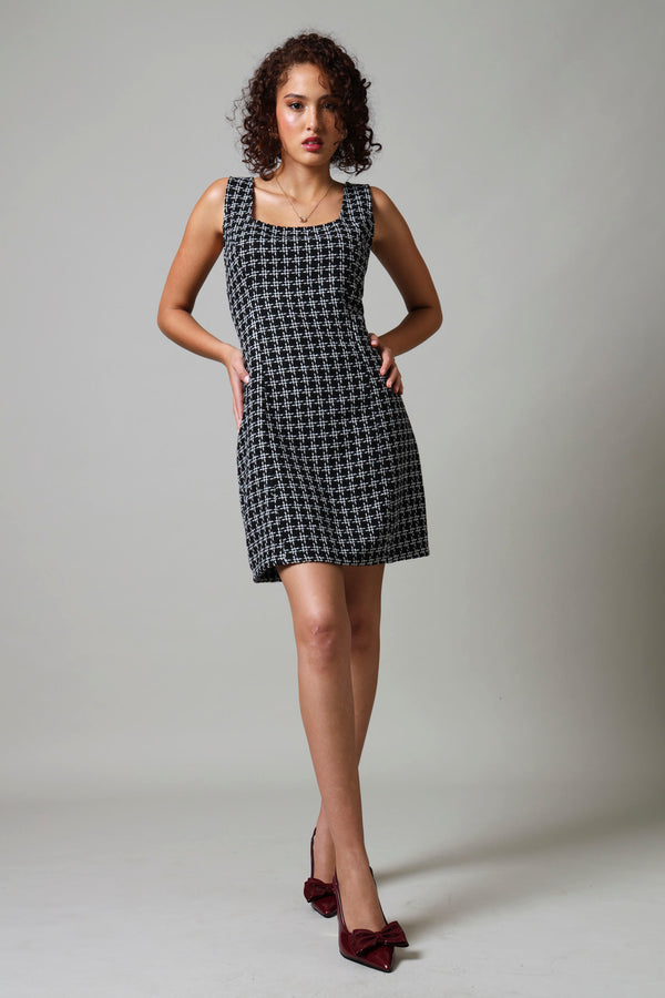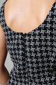 Embrace effortless style with this Short Sleeve Pinafore Dress in classic black and white tweed. The timeless pattern offers versatile styling options while the pinafore design provides a flattering silhouette. Perfect for layering over tops or wearing on its own for a polished look that transitions seamlessly from office to evening events.