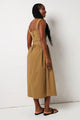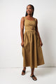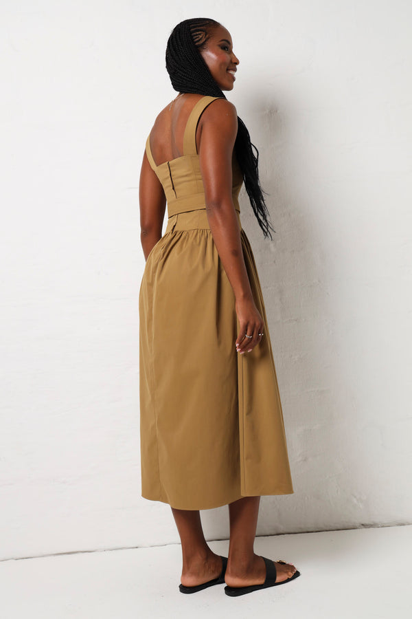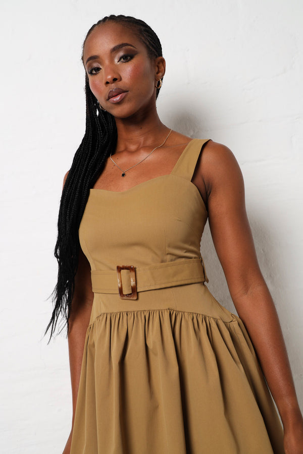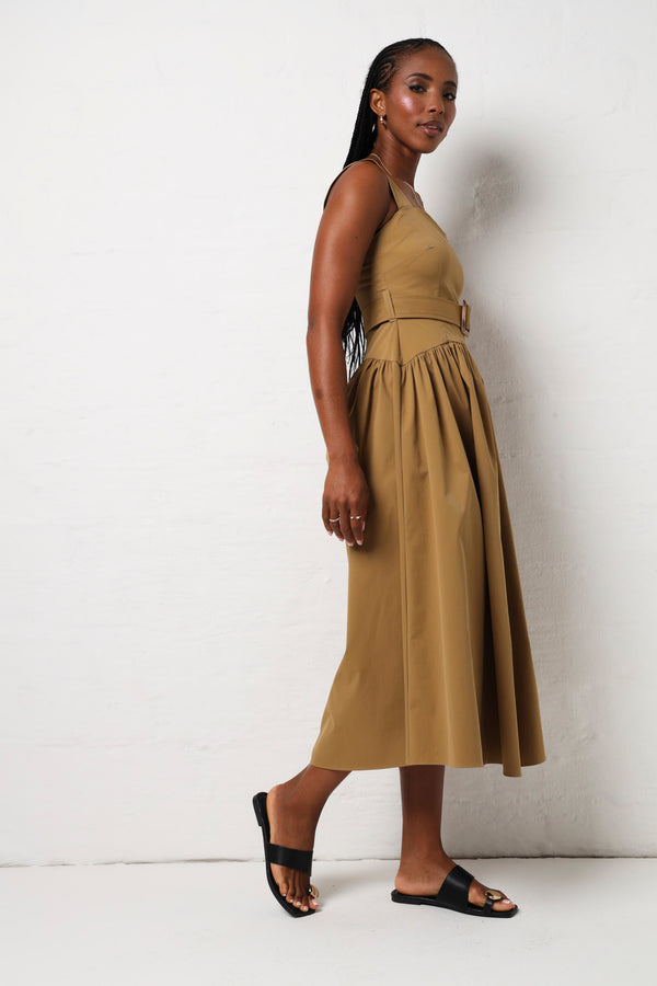 Effortless elegance meets fun in this olive twill midi dress that's ready for anything. The sleeveless silhouette keeps things breezy, while strategic ruching adds dimension and flatters your figure. Cinch it with the included belt to define your waist and create the perfect shape. Whether you're heading to brunch, a garden party, or a casual dinner date, this versatile piece transitions seamlessly from day to night. The rich olive tone pairs beautifully with everything in your wardrobe, making it a go-to favourite you'll reach for again and again.