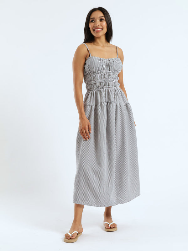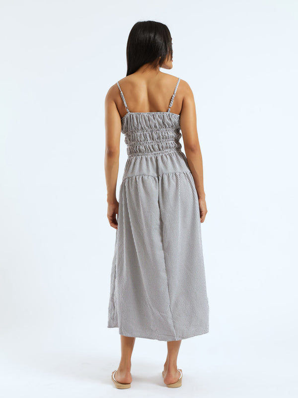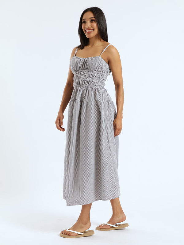 Step out in style with the Strappy Elastic Detail Maxi Dress in timeless black and white. Its playful elastic straps offer a comfortable fit while adding a touch of charm, making it perfect for sunny days or breezy evenings. The flowing maxi length moves gracefully with every step, ensuring you look effortlessly chic wherever you go. Perfect for casual outings or a fun night out, this dress combines comfort and flair in one stunning piece.