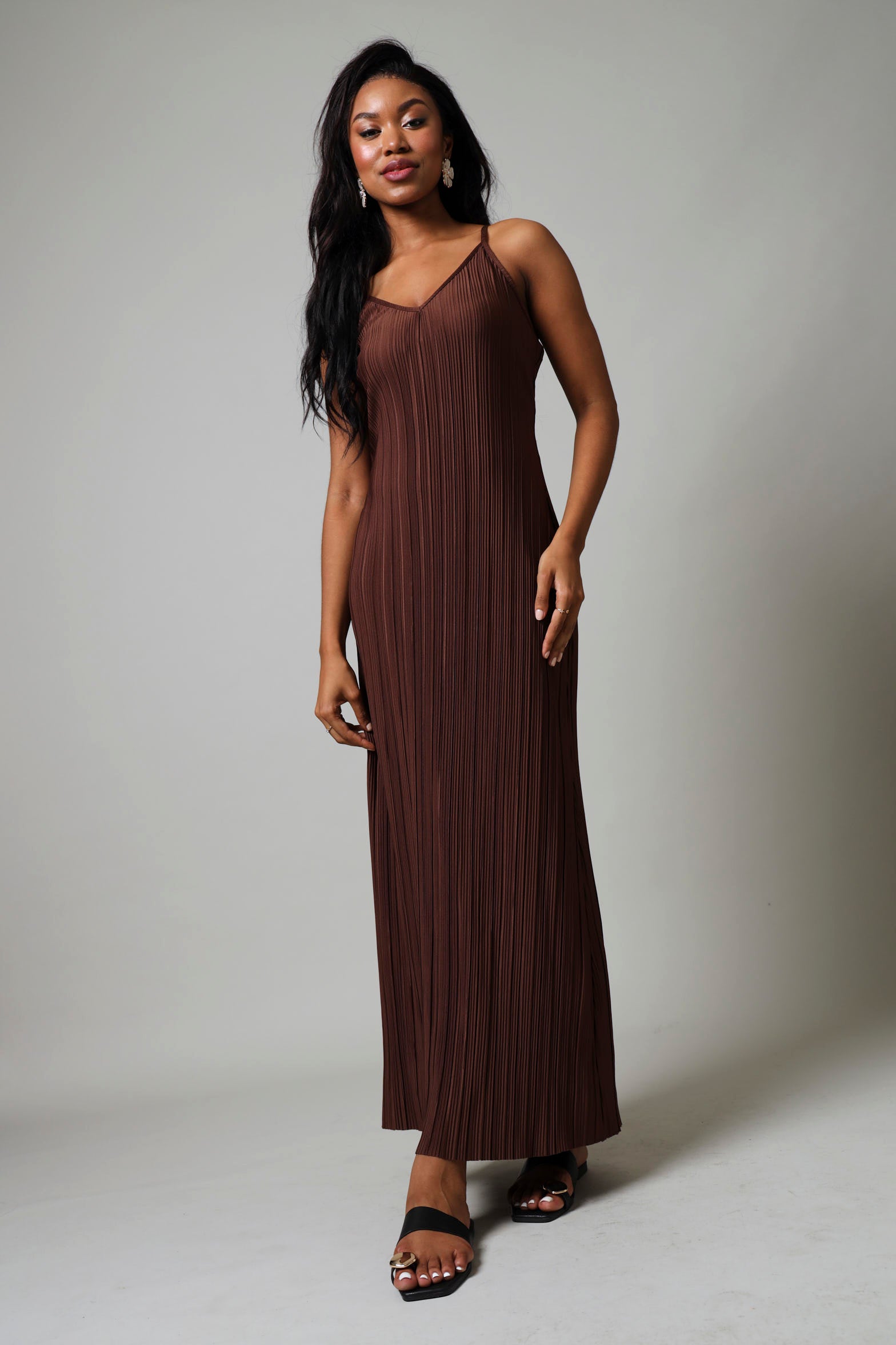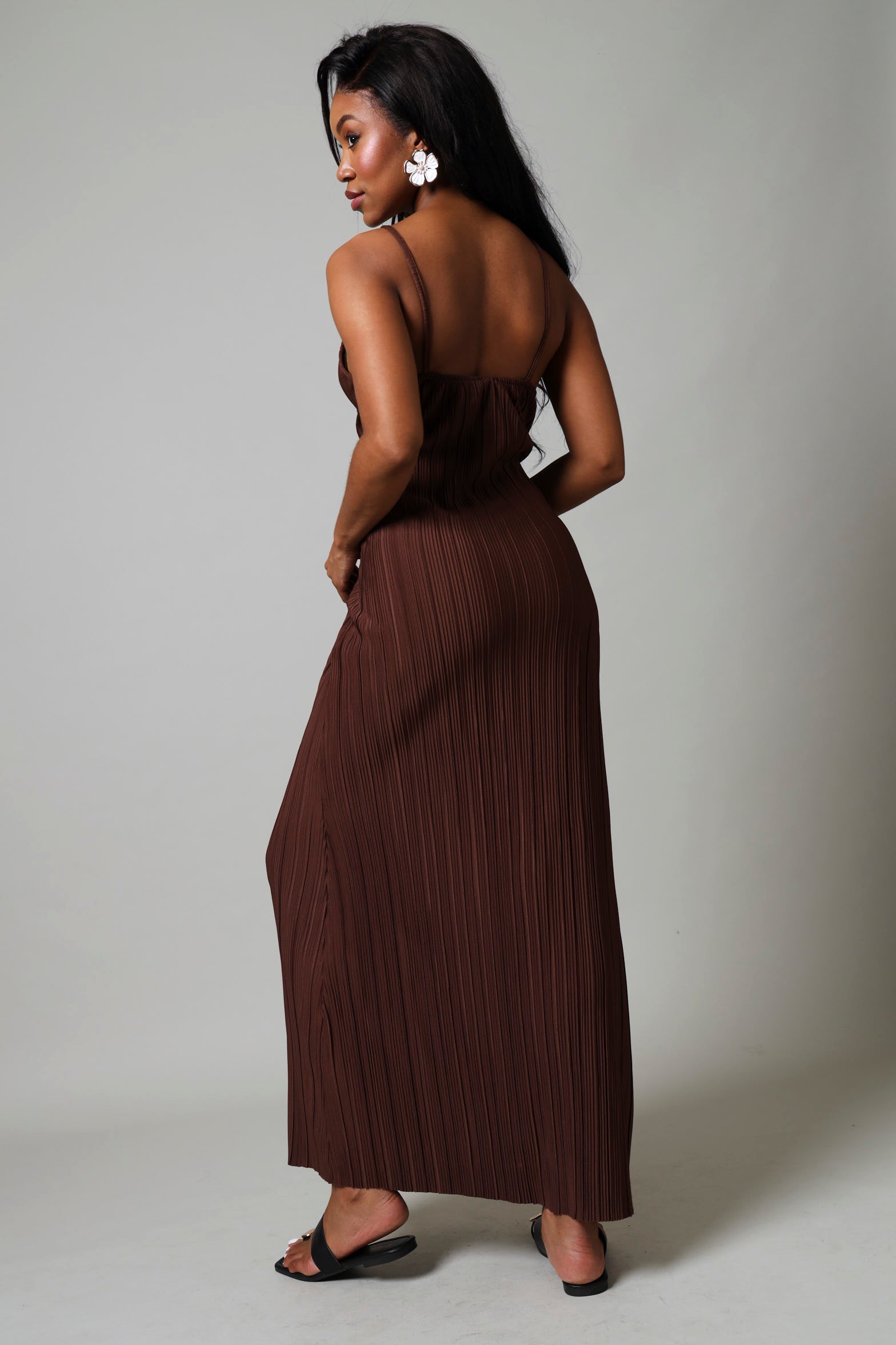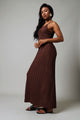 Glide through your day in this stunning maxi dress that combines elegance with a dash of drama. The strappy neckline keeps things interesting while the flare hem adds movement and flair to every step. Crafted in a rich brown that's endlessly versatile, this dress transitions seamlessly from brunch to evening plans. Comfortable, flattering, and ready to become your new go-to for any occasion that calls for effortless sophistication.